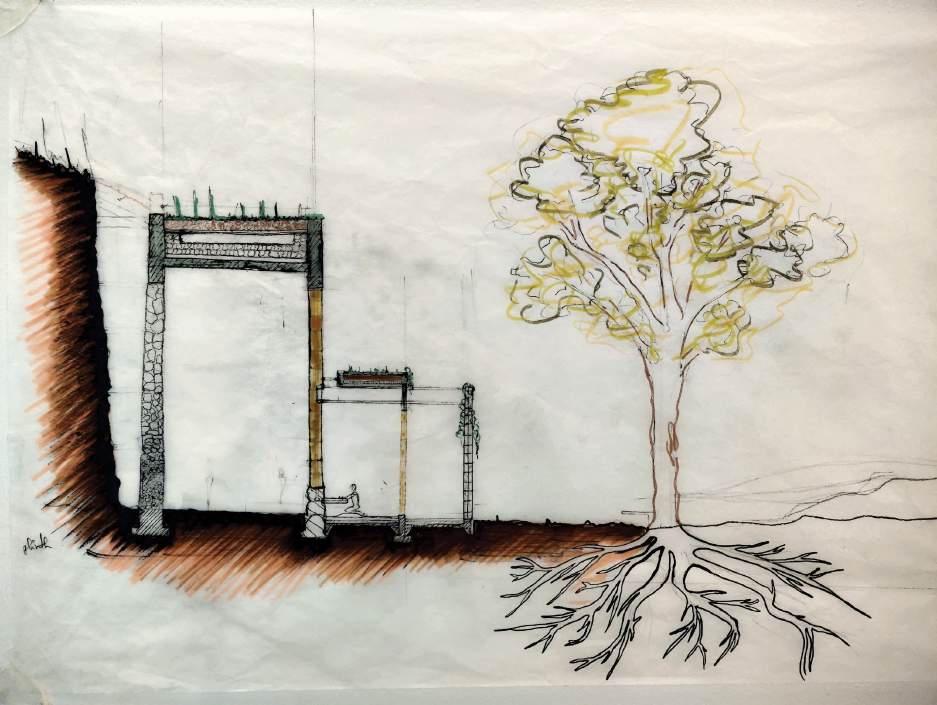 The journey is a short walk from the existing playhouse on the site to the building thats rising from the contours. The walk into the building towards a gallery that overlooks the gardens and frames the rising sun in all seasons in a different way, to walking into the studio and working with refections of natural light and ending the day under a shaded area in the lawn looking at the sun and reflecting on the day.