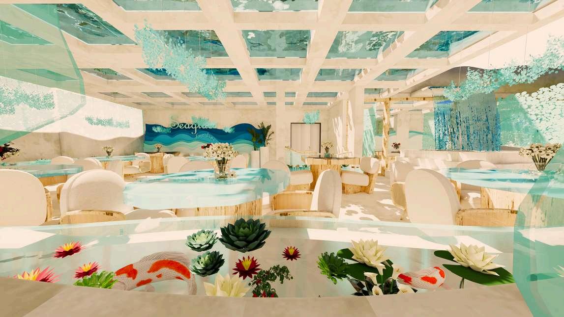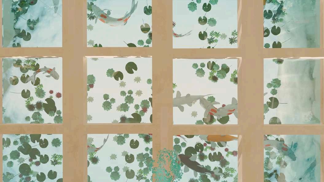 A cascade of sea-glass-like acrylic pieces, in soft turquoise, falls from the skylit ceiling down to the pond’s edge. Overhead, a second koi pond floats above over framed skylight panels aligned seamlessly with the beams and columns.