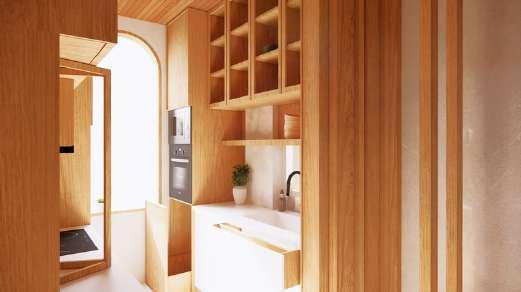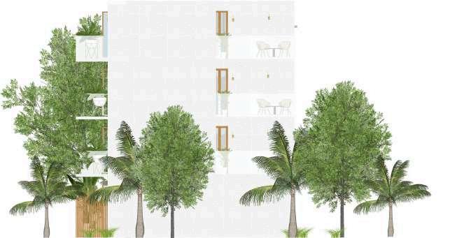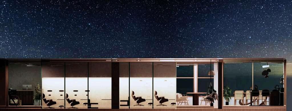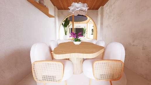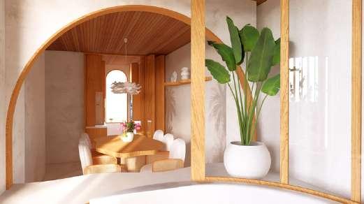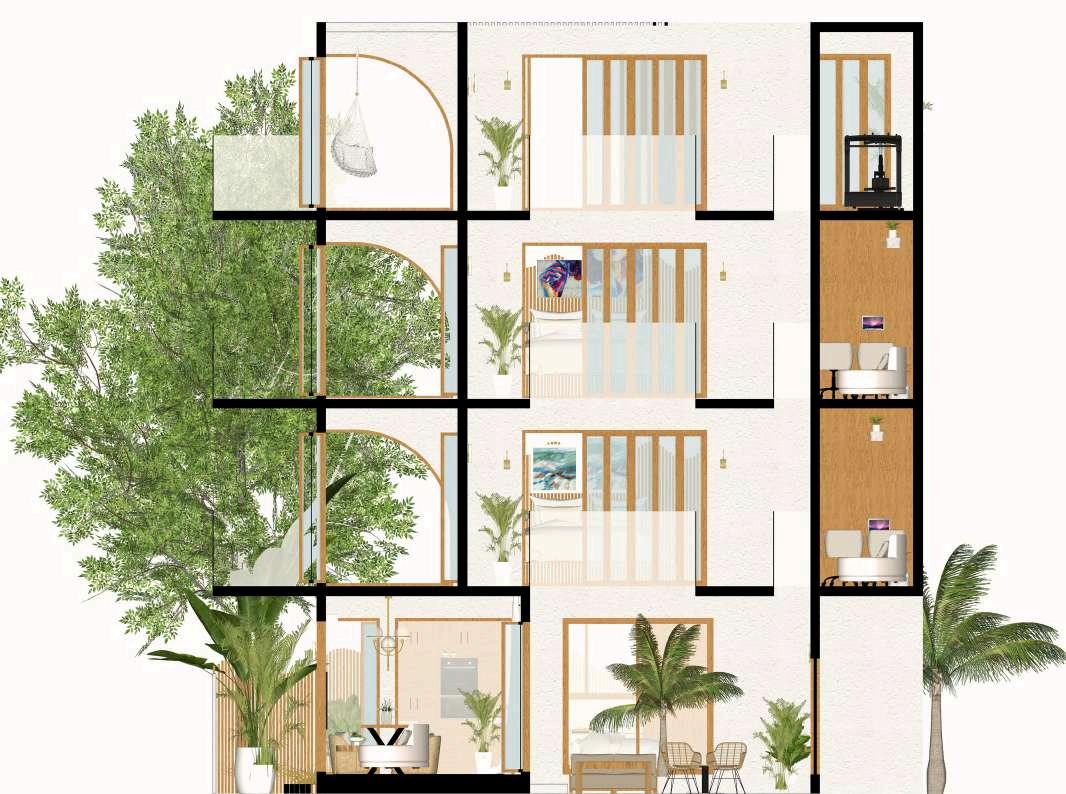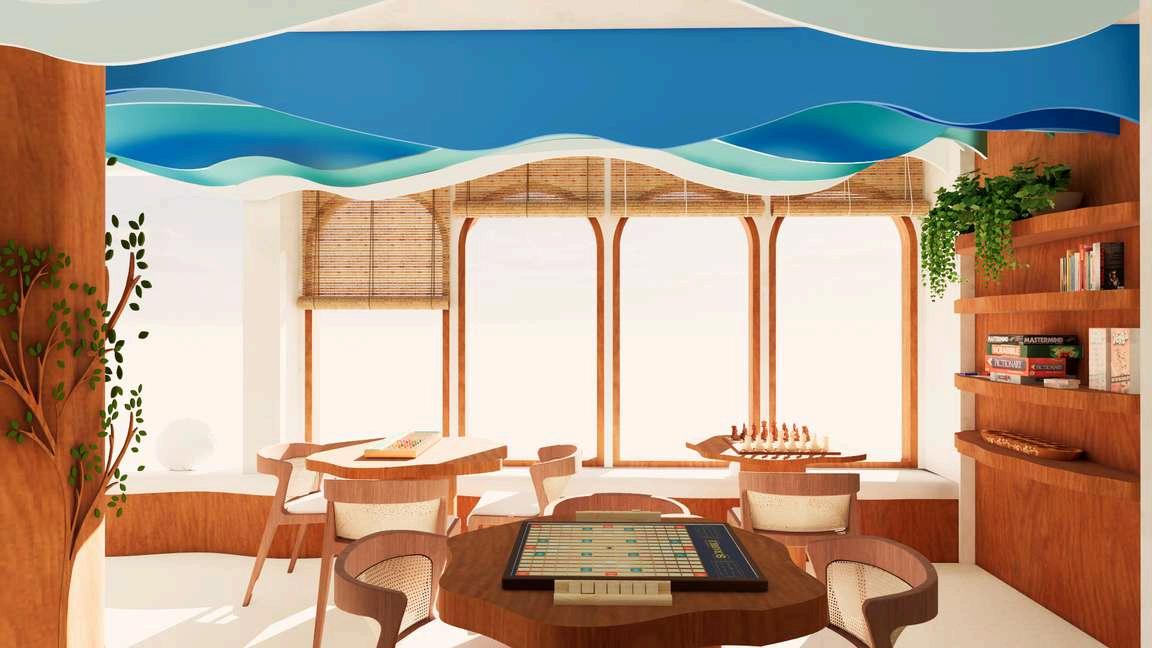 Like an oasis offers breeze and green, this family-friendly retreat offers crossventilation throughout. Wooden revolving slats trace the exterior - folding open or shut on a whim, offering privacy from busy roads without sacrificing light or flow. The conversation pit features rotating windows and optional curtains, perfect for stargazing beneath constellation cut-outs carved into the false ceiling.