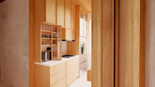 Stepped levels - up from the kitchen and down into the outdoor lounge - gently define space while preserving an open layout. Oak wood details, limewashed walls, a clay-plastered stepped floor, and warm wood-paneled ceilings all create a zen oasis for the length of your stay.