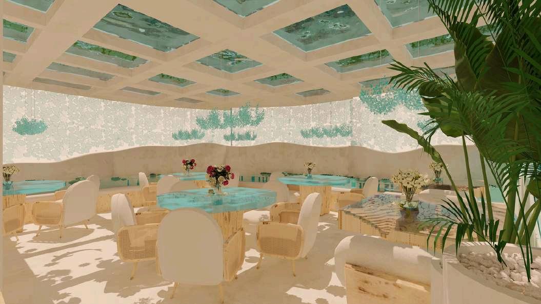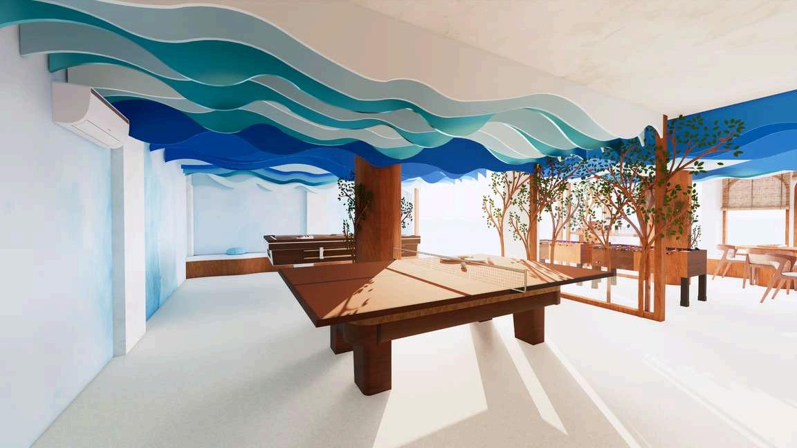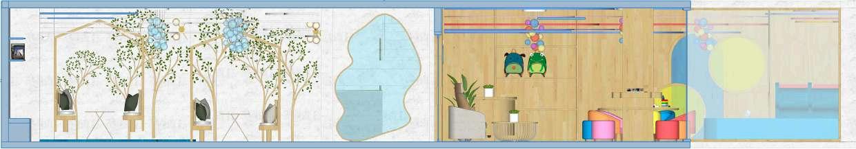 In the co-work space, white clouds define the ceiling with minimal raindrop pendant lights, while the kids’ club plays with sunset hues and colorful droplets for a more whimsical take. A resin platform in the adult zone mimics a tranquil oasis, grounded by wooden plant murals that climb the walls above bench seating, offering a shaded, cocooned feel.