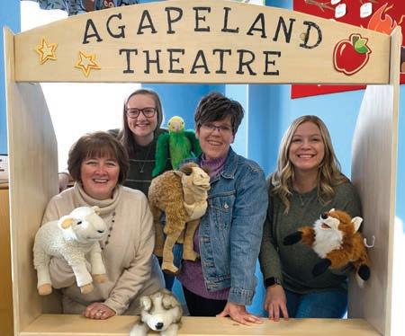 Agapeland Preschool teachers and aides pose in the school’s puppet theater. Michele Hoch, left, Veronica Hornberger, Wanda Heimbach and Samantha Hoover.
