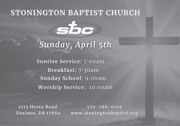 Easter Sunrise Service, April5,2026-7:00a.m. Bring a chair to Moser Farm,730 North Ridge Rd., Milton Indoor Easter Service, April 5,2026-10:15a.m. worship www.pcmilton.org All