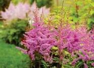 • Astilbe. Add a splash of colour to your garden with these pink, red, mauve or white flowers. These delicate blooms will create a cheerful atmosphere.