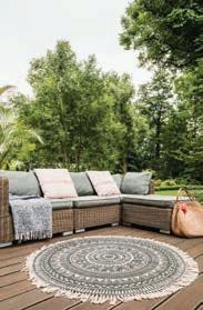 If your outdoor space is shaded or covered, add brightness with a rug in a more vibrant colour. For areas that aren’t protected from rain or windborne dirt, choose a dark rug that’s easy to clean.