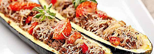 Ingredientes: 4 calabacines medianos, 200 g de carne picada magra, 1 cebolla pequeña ,1 morrón rojo pequeño, 2 tomates medianos, 2 dientes de ajo, 1 cucharada de aceite de oliva, 50 g de queso rallado bajo en grasa, 1 cucharadita de sal, 1/2 cucharadita de pimienta negra y 1 cucharadita de orégano seco.