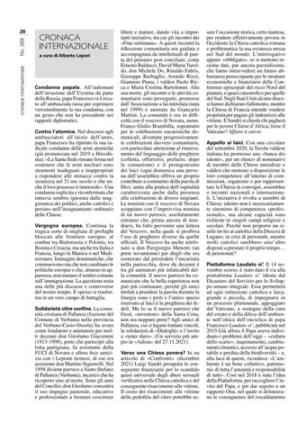 Contro l’atomica. Nel discorso agli ambasciatori all’inizio dell’anno, papa Francesco ha ripetuto la sua radicale condanna delle armi atomiche (già pronunciata nel 2019 a Hiroshima): «La Santa Sede rimane ferma nel sostenere che le armi nucleari sono strumenti inadeguati e inappropriati a rispondere alle minacce contro la sicurezza nel 21.mo secolo e che anche il loro possesso è immorale». Una condanna esplicita e riconfermata che tuttavia sembra ignorata dalla maggioranza dei politici, anche cattolici e persino nell’insegnamento ordinario delle Chiese. Vergogna europea. Continua la tragica sorte di migliaia di profughi bloccati alle frontiere europee, al confine tra Bielorussia e Polonia, tra Bosnia e Croazia, ma anche tra Italia e Francia, lungo la Manica o nel Mediterraneo. Immagini drammatiche, che commuovono ma che non cambiano le politiche europee e che, almeno in apparenza, non mutano il sentire comune sull’immigrazione. La questione resta una delle più discusse e controverse del nostro tempo. E spesso si trasforma in un vero campo di battaglia. Solidarietà oltre confine. La comu-