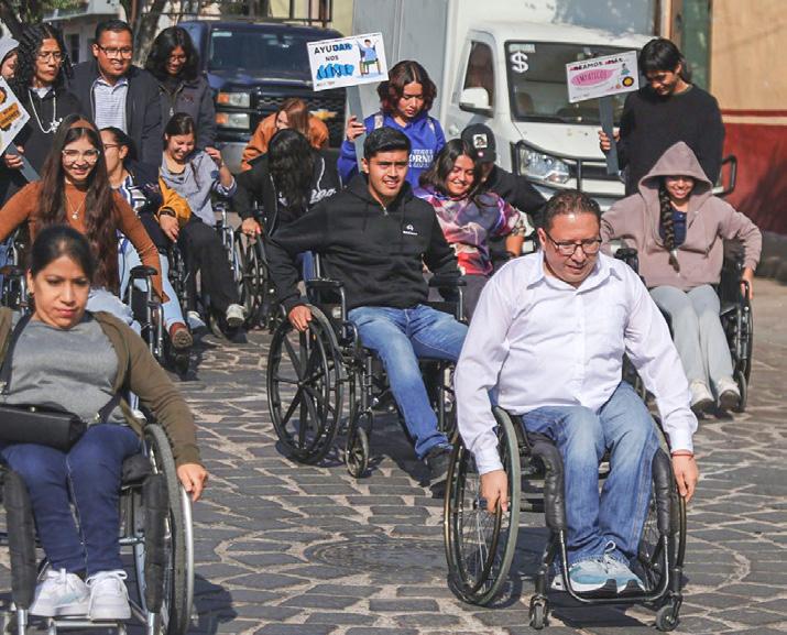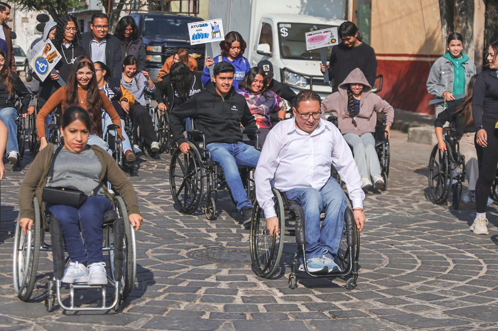 En sillas de ruedas, los jóvenes partieron de la Glorieta Francisco García Salinas hacia el Jardín Principal Rafael Páez, guiados por Ricardo de Luna, enlace municipal del Instituto para la Atención e Inclusión de las Personas con Discapacidad del Estado de Zacatecas. Durante el trayecto debieron subir y bajar las rampas construidas en distintas calles y aceras, experimentando la complejidad del desplazamiento por estas zonas.