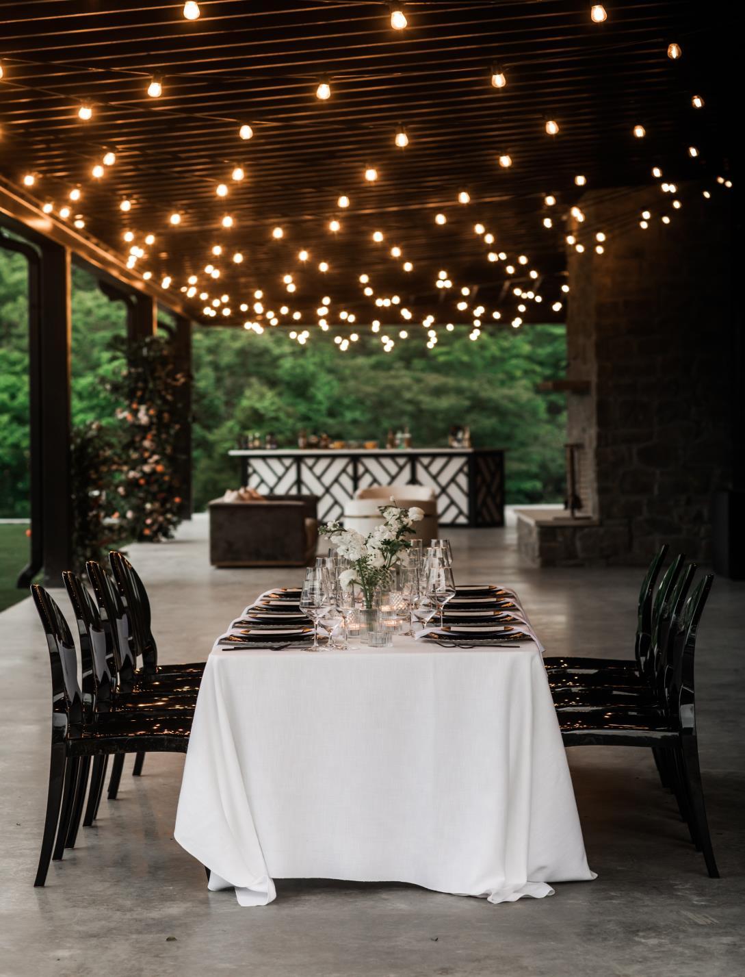 Serene and dream-like, the patio off our main building, complete with bellini lights, stone fireplace and gas lanterns, provides an exquisite cocktail hour with breathtaking views of rolling hills.