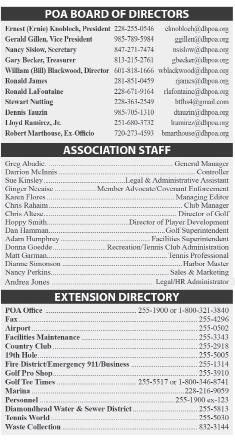 Continued from Page 1 were offered in the various locations. Our approximately $650 per year in POA dues seems like a very good deal. With the weather getting warmer, consider spending some time on our patio enjoying some menu offerings and/ or a beverage of your choice, and check out the unique view of the elevation change behind the club.