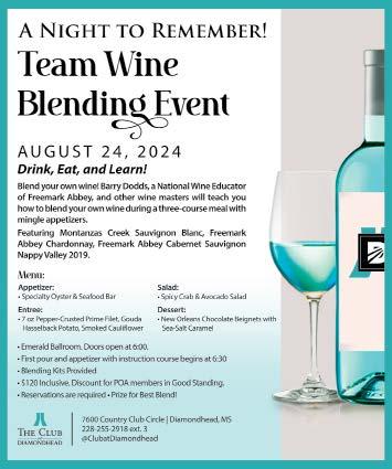 Blend your own wine! Barry Dodds, a National Wine Educator of Freemark Abbey, and other wine masters will teach you how to blend your own wine during a three-course meal with mingle appetizers.