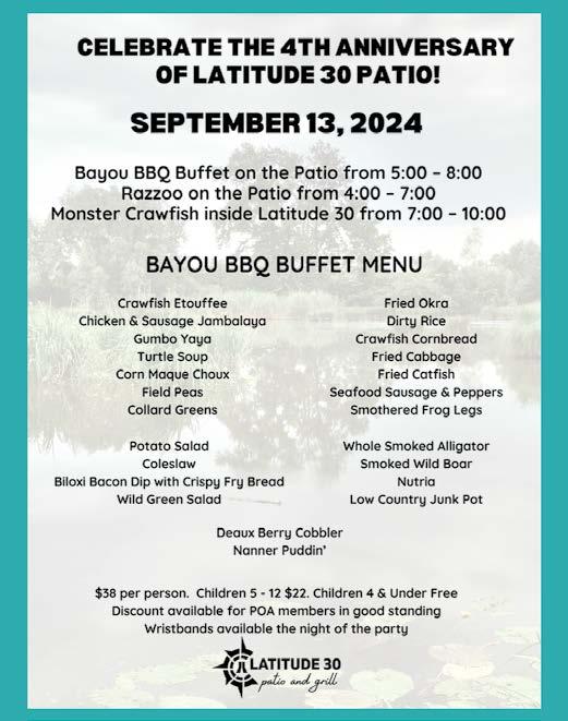 Join us down the bayou as we celebrate the 4th anniversary of The Patio! We will have a Bayou BBQ Buffet on the Patio from 5:00 – 8:00, with Razzoo playing from 4:00 – 7:00 on the Patio. Inside, Monster Crawfish will be playing in Latitude 30 from 7:00 – 10:00.