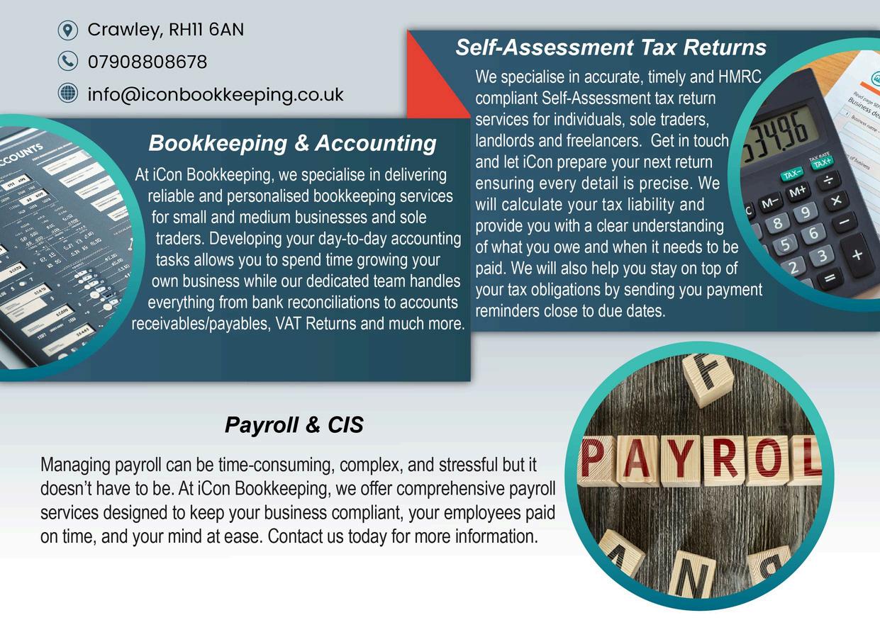 Unlock financial peace of mind with iCon Bookkeeping Ltd, a trusted and certified bookkeeping practice based in West Sussex, dedicated to helping small and medium-sized businesses thrive through accurate, efficient, and personalised financial services Founded and led by Marcelina Jesus, a member of the Institute of Certified Bookkeepers, the firm combines deep expertise with cutting-edge technology to simplify financial management for its clients As a licensed and AML-supervised practice, it is recognised for its professionalism and reliability, strong commitment to integrity, precision and client success iCon Bookkeeping offers a comprehensive suite of services including day to day bookkeeping, payroll, reporting and self-assessment tax returns