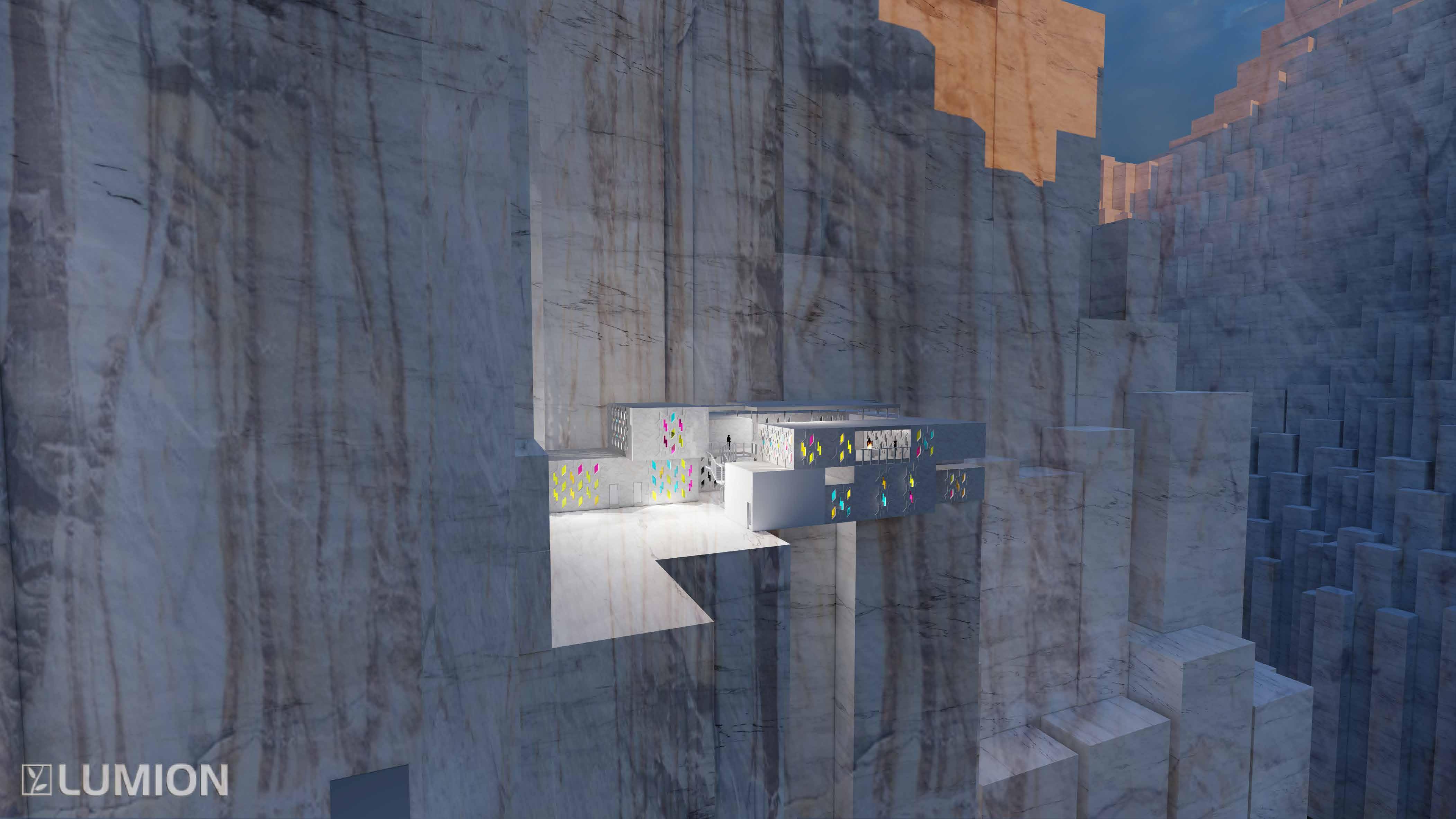 Carrara Marble quarries are rich with rare and beautiful materi al. During the design phase, the computerized aggregation made it simpler to understand the building’s program and how the pieces can connect. Creating the pieces began from thinking about the fractleness of the marble itself. As the process went along, each piece made another and another until a whole wall was formed. The idea is the pieces are chiseled and cut on site and assembled through a series of steel rods. The extruded aluminum frames the rooms and the people on site can enjoy putting it all together. Overall, Naós Tis Filías (Temple of Friendship) is an environment that compliments the meaning of friendship, teamwork, and legacy by giving you the freedom to created something all your own.