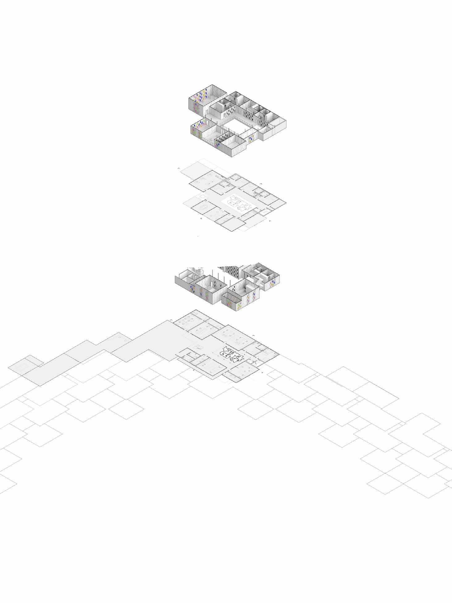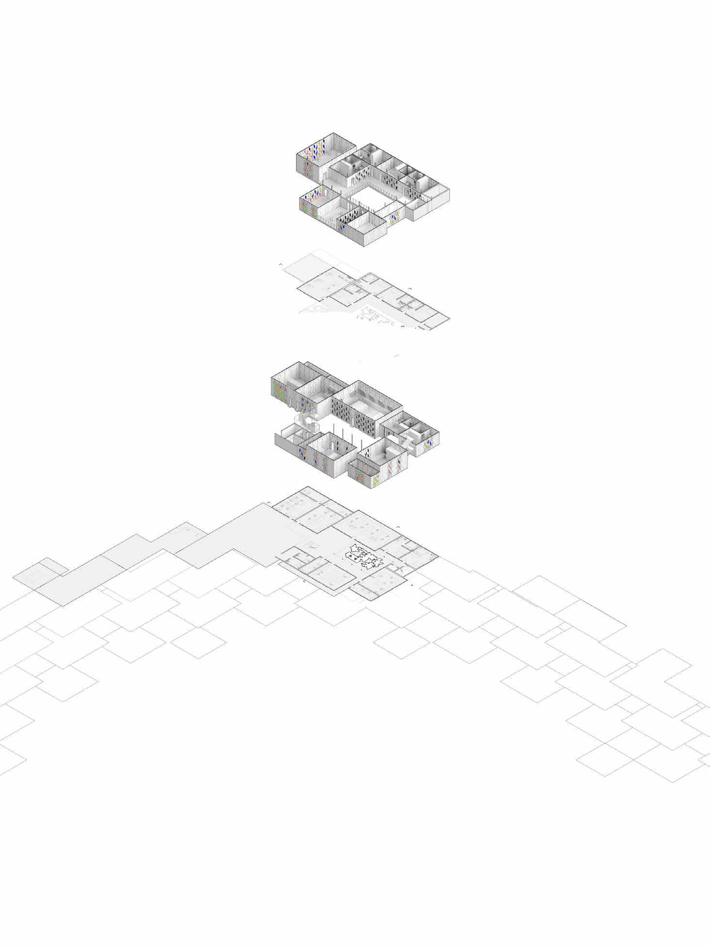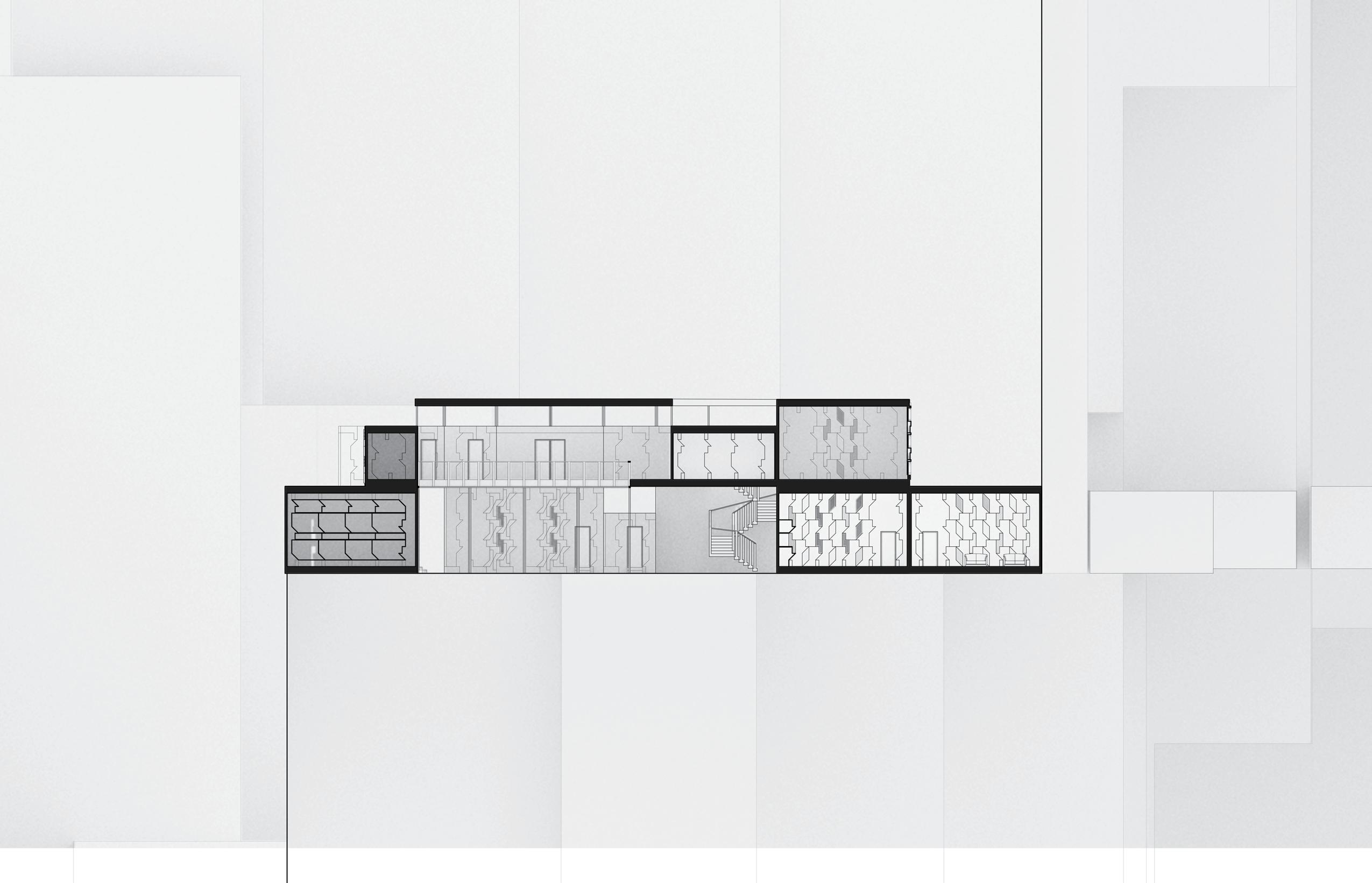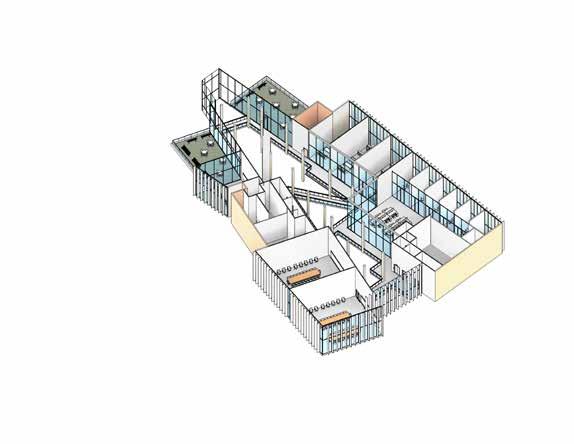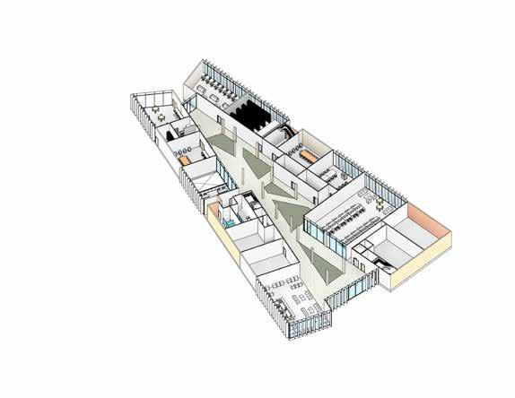 The design process starts with programmatic boxes, each representing a space within the building. These initial boxes are conceptual placeholders, defining the basic requirements of the program. Through pushing, pulling, twisting, and condensing the boxes, they are transformed into a cohesive and functional composition. The result is architecture that balances spatial complexity with a disciplined arrangement.