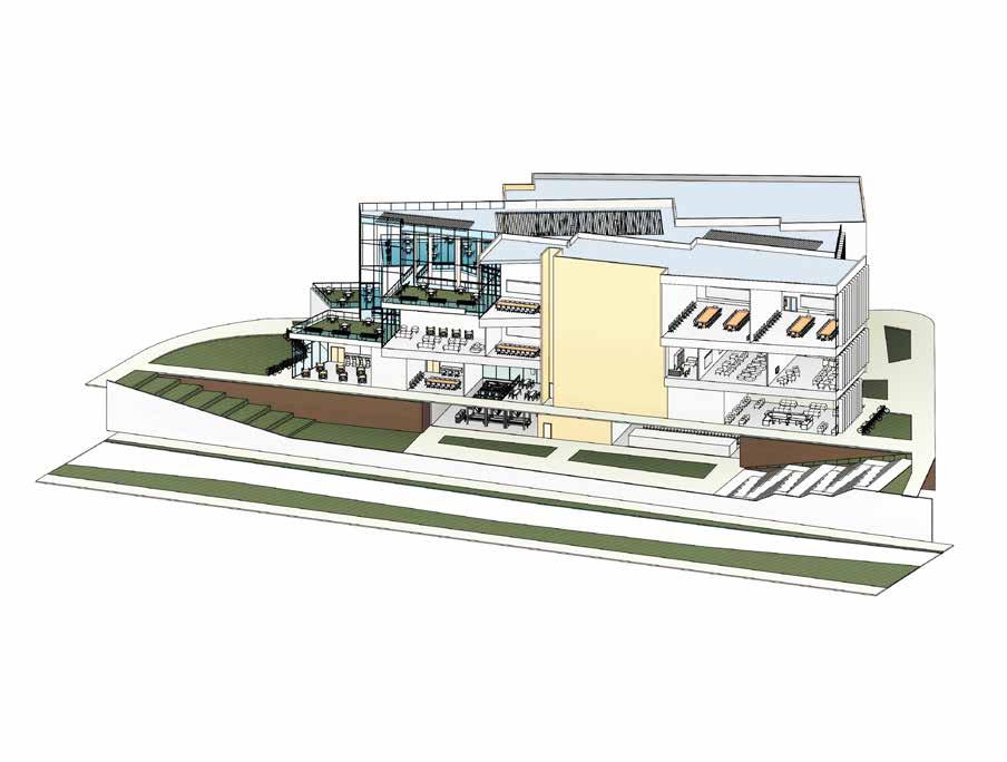 Overhangs are placed to cast linear shadows that change throughout the day, emphasizing the building’s geometry. Shadows enhance the external program and circulations of the building, inviting people to interact with the site and its surroundings. These elements are designed to interact with the boxes, reinforcing the building’s purpose.