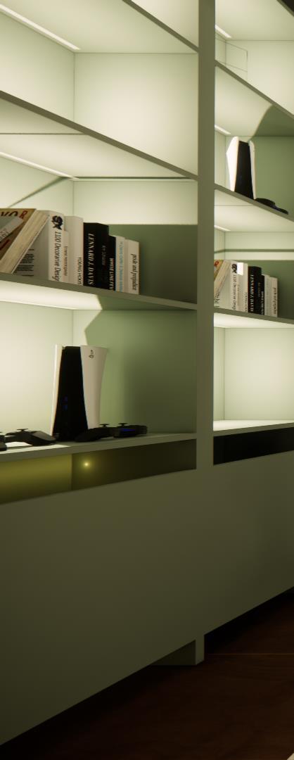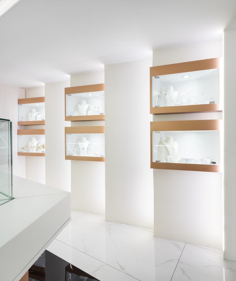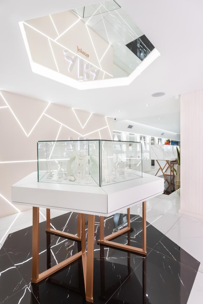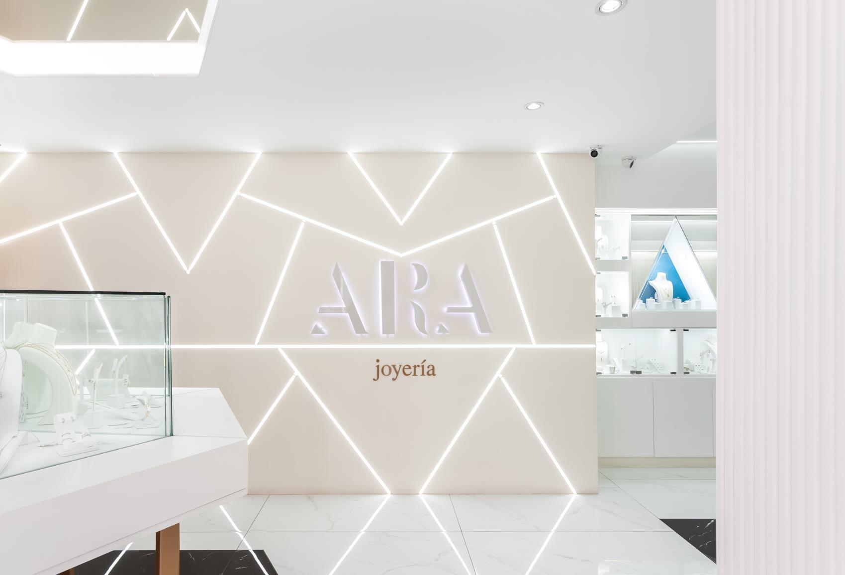 ARA," a feminine fusion of astrology and jewelry. The challenge was to craft something distinct and unique. Drawing inspiration from the brand's triangle symbol and the color palette of baby pink, blue, black, and white, we conceived a standout design. The centerpiece is the captivating "constellation wall," a lighting mural symbolizing stars with higher lights at each edge. This project beautifully intertwines celestial elements with chic aesthetics, bringing a touch of cosmic allure to the feminine realm of ARA.