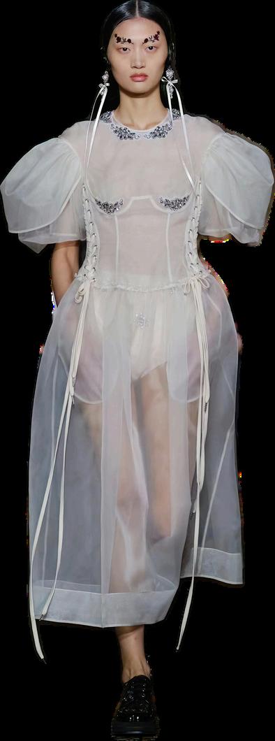 Fragilidad y renacer: las transparencias y los volúmenes orgánicos de Rocha simbolizan la vulnerabilidad de Summer, pero también su deseo de florecer otra vez. Las capas evocan la superposición de recuerdos, duelos y nuevos comienzos.