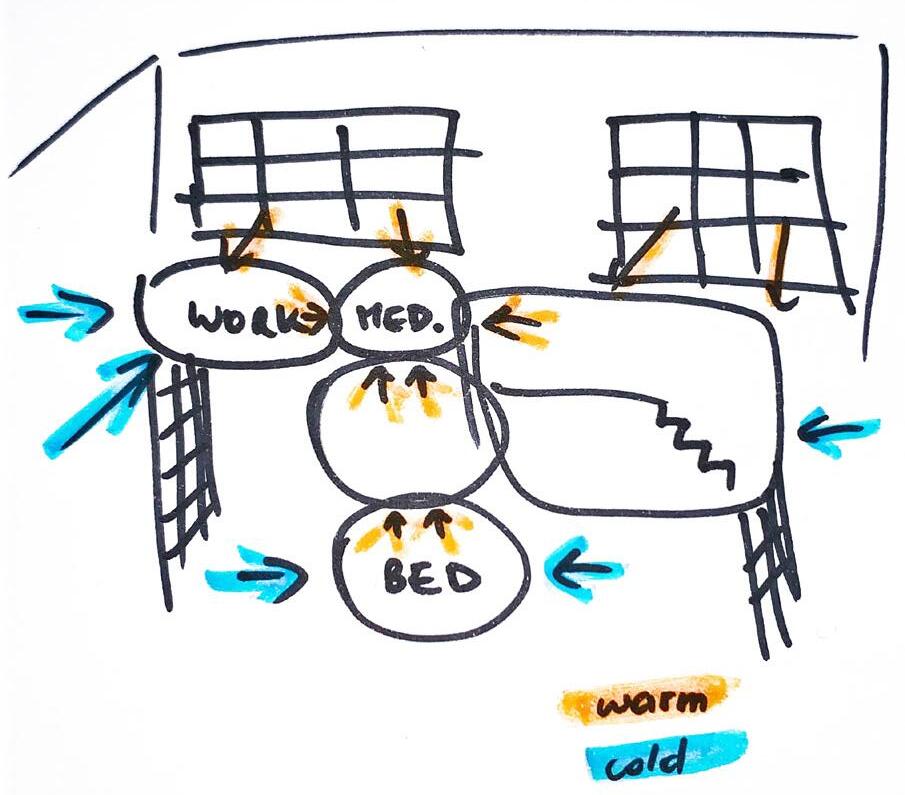 è stata dedicata all’equilibrio naturale della temperatura negli ambienti. Gli elementi essenziali per la struttura, la temperatura ottimale per le diverse attività e l’interazione tra spazi e facciate sono stati analizzati a fondo.