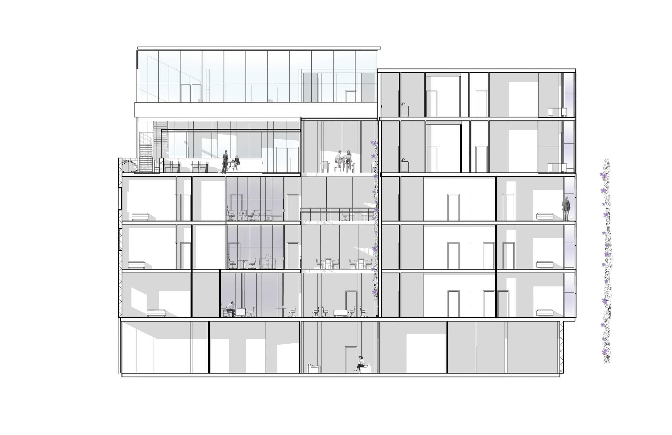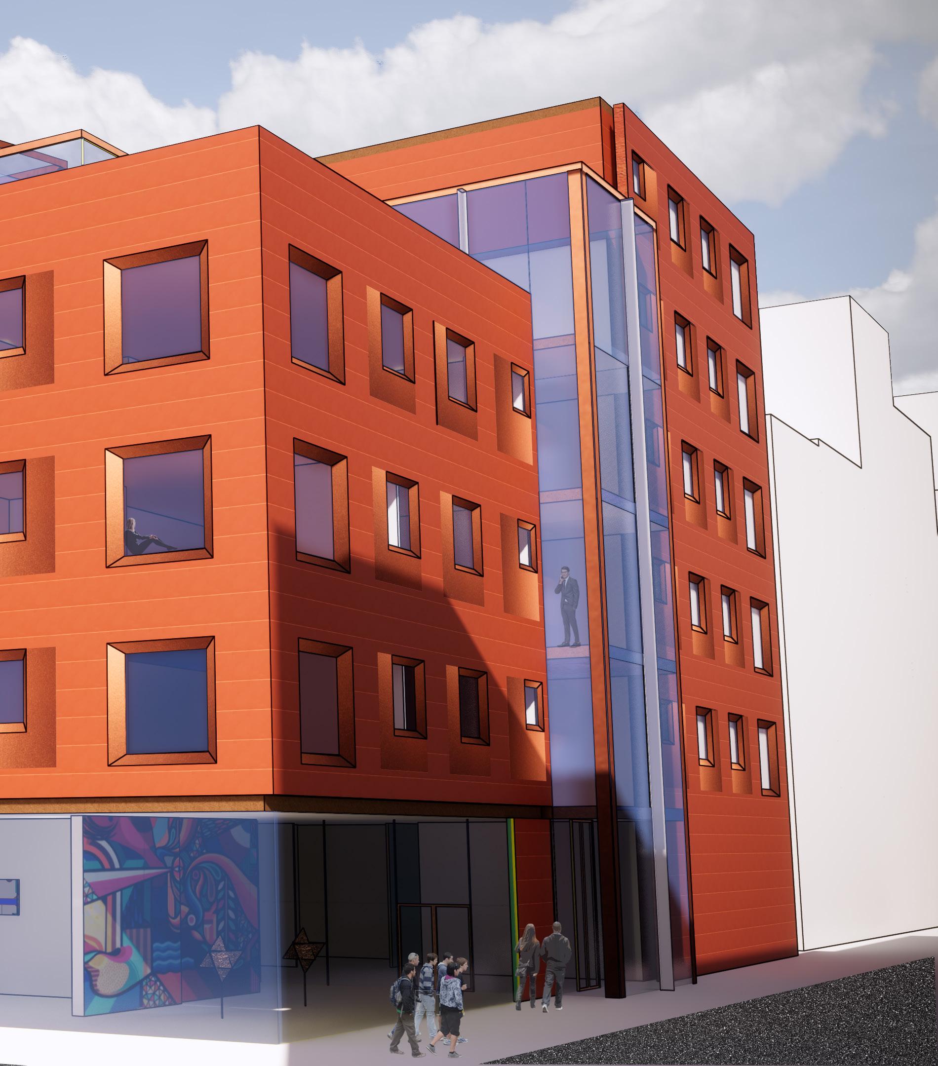 The design includes two main points of entry at different elevations given the slope on the site. One includes an outdoor dining area while the other features an open-air gathering space that extends into the lobby. These spaces function as an extension of the campus adjacent to State Street.