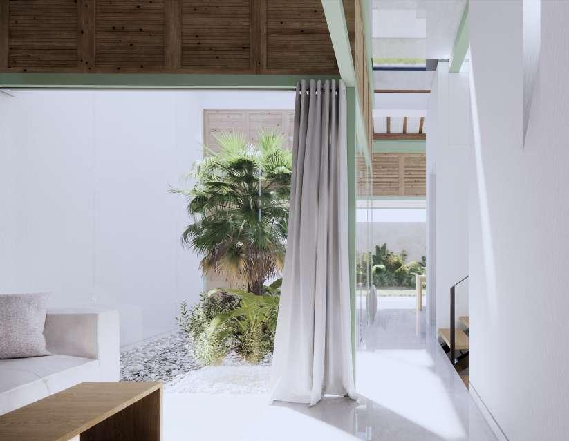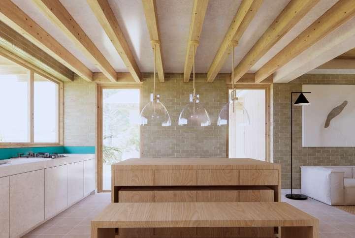 The colour palette was selected with the aim of respecting the nature of the materials used in ancestral and mixed construction techniques, leaving their natural finish visible to the eye. We wanted to exalt the semi-open aspect of the house, seeking to highlight the vegetation and the surrounding view.