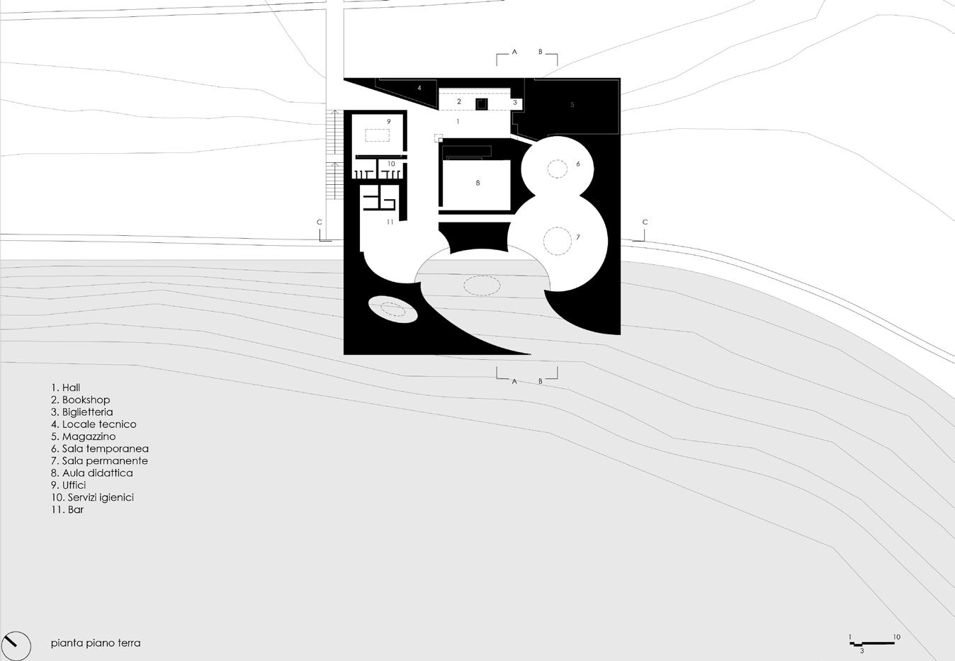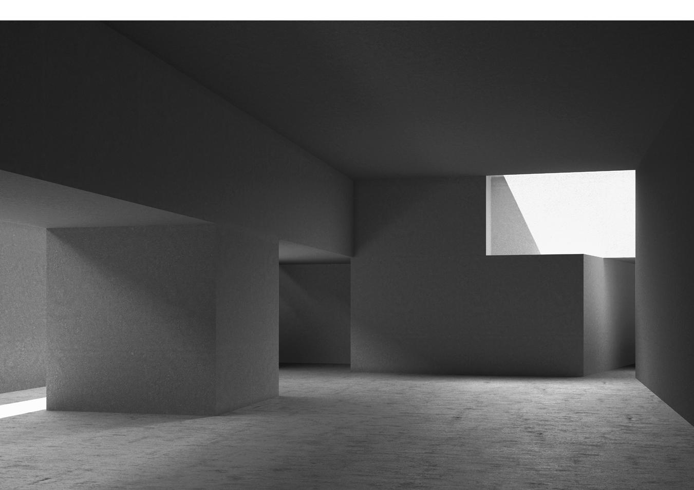 La oscuridad desgarrada por un rayo de sol, el reflejo y el sonido inconfundible del agua, el tiempo. Un revelador de enigmas y al mismo tiempo un creadorEste último, junto con el agua, dio forma a nuestro proyecto, erosionando un bloque de planta cuadrada ubicado en la parte más fuerte y más característica del lugar, en el límite entre la tierra y el agua.