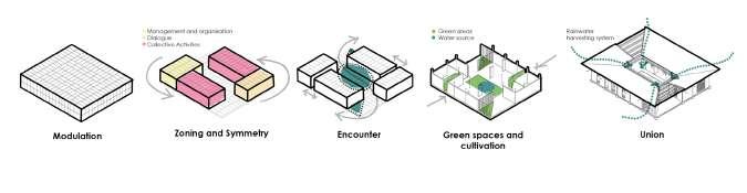 Formalmente, el concepto de paridad se traduce en simetría y se desarrolla a partir de dos volúmenes principales donde se encuentran las áreas administrativas, educativas y de diálogo.