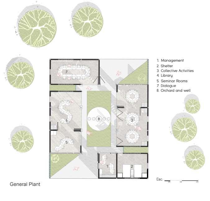 Las áreas de diálogo y administración están ubicadas frente a frente, una en cada extremo del edificio, pero con una relación directa a través el patio central, lo que permite una comunicación fluida con el resto del edificio. Aunque el diseño flexible de los espacios responde a una posible necesidad de refugio en caso de emergencias, también proponemos una distribución para aquellos que necesiten hacer uso de él (cuando se encuentre disponible), ya sean para talleres con entrenadores invitados o espacios de encuentro para los habitantes del pueblo.