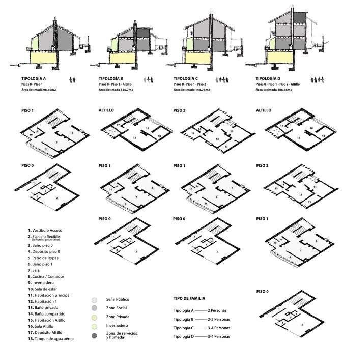 Flexibilidad económica, productiva y social El sistema constructivo tipo porche y la zonificación alrededor del punto de producción de calor (chimenea) permiten la posibilidad de un crecimiento vertical y la configuración de espacios flexibles según las necesidades de la familia, ya sea aumentando el número de pisos o replanteando las funciones de los espacios habilitados para el uso mixto de la vivienda.
