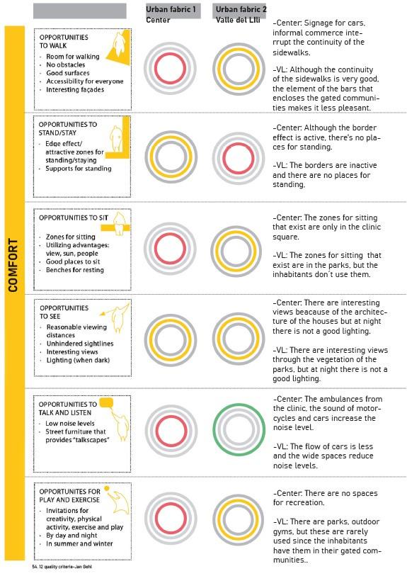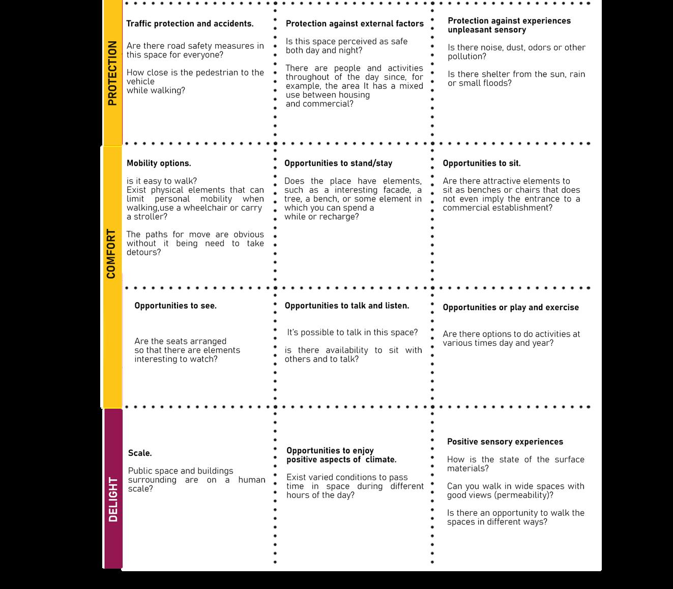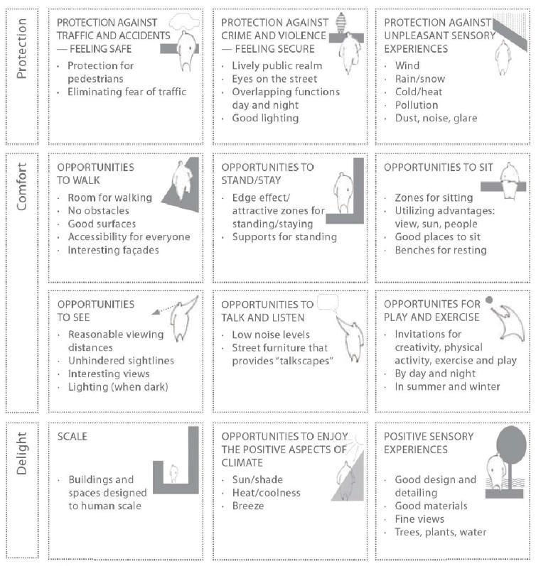 In Gehl’s text, he exposes 12 vital criteria divided into three groups (protection, delight and comfort) for the urban spaces of the city and also as a systematic overview of the most important quality criteria. (Gehl et al., 2006).