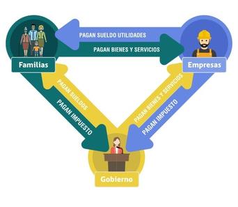 Mientras las familias pagan por los bienes y servicios que producen las empresas, éstas también pagan les por el trabajo o los activos que ofrecen Así, retribuyen con salarios a los empleados, con intereses a los ahorristas o inversionistas, y con rentas a los propietarios de tierras o bienes muebles alquilados. Y así, las familias pagan impuestos al gobierno (estado), mientras que este les entrega bienes, servicios y ayudas sociales De la misma forma, las compañías pagan impuestos al gobierno y este les ofrece bienes, servicios y en algunos casos subsidios o apoyos