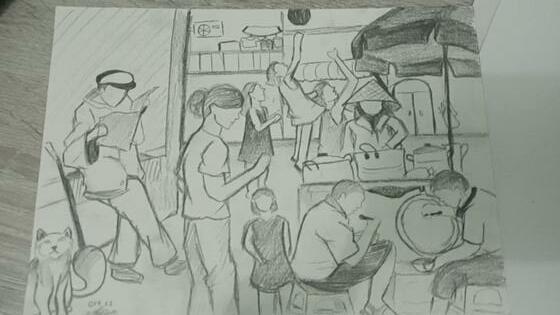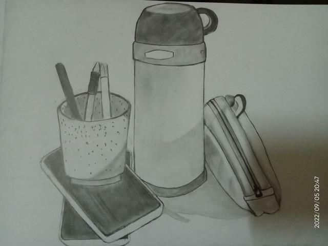Drawing some objects in front of us. I used my friend's bottle, my other friend's pencil case, my phone and my other than the other friend's, my stationary, and Ms. Wening's random aesthetic mug.