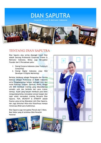 Dian Saputra adalah Motivator Nasional yang dipercaya oleh kalangan Corporate di Indonesia. Anda ingin merasakan fantastis nya training yang dibawakan silahkan bisa menghubungi 081249758328