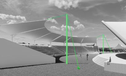 Pada bagian panggung membran ditumpu dengan truss frame sedangkan struktur membran yang berada pada amphiteathre ditumpu dengan struktur kabel.