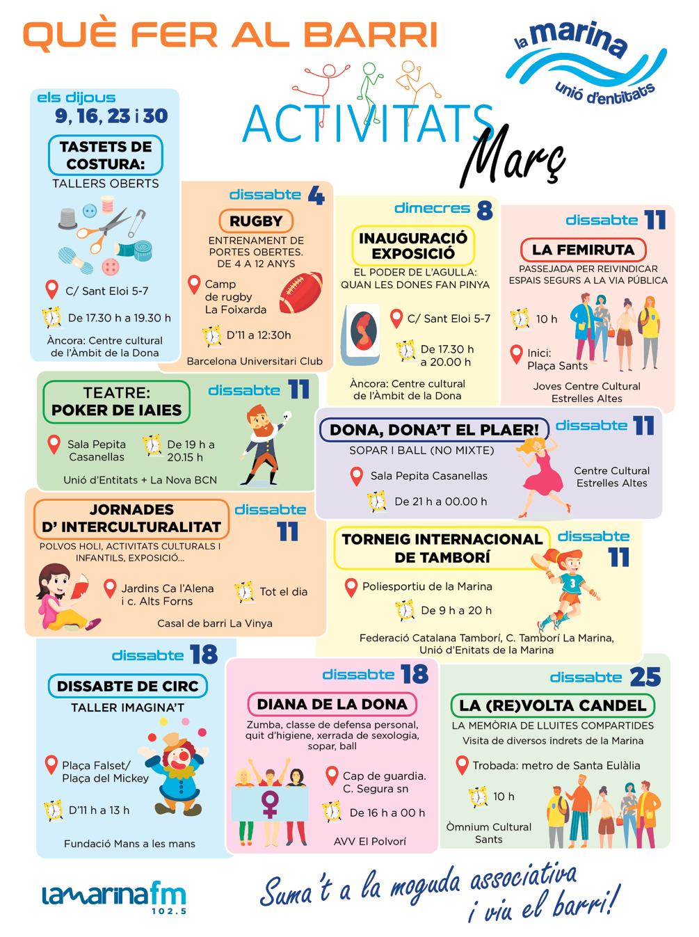 A més a més, per desgràcia, és també bastant freqüent que siguin notícia casos d’abusos sexuals, assetjament o violacions, com pot ser, per exemple, el mediàtic cas de l’exjugador del Futbol Club Barcelona, Dani Alves. Aquesta mena de situacions, tot i un cert avenç força positiu en els drets de les dones, continuen produint-se de forma diària. “Precisament per aquest i altres motius esdevé de vital importància manifestar-se, denunciar i reclamar que la lluita feminista continuï endavant fins a acabar del tot amb les desigualtats”. Aquest és l’esperit d’espais de la Marina que hi treballen, entre els quals el centre cultural Àncora, el centre cultural Estrelles Altes, Les joves d’Estrelles Altes, l’Engranatge, el Pla Comunitari, l’Associació Guineocatalana, la Associació Escola Dominical Undebel, el casal la Vinya, la Bàscula, l’espai Jove Química o l’Associació de Mitjans de Comunicació Local.