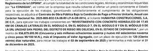 El contrato está vigente desde el pasado 3 de septiembre y se vence el 31 de diciembre, que es cuando la constructora debe entregar las obras en Delicias, Chihuahua, con un costo de 56.8 millones de pesos más el Impuesto al Valor Agregado (IVA).