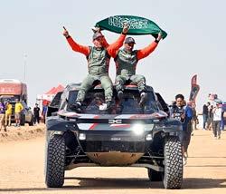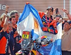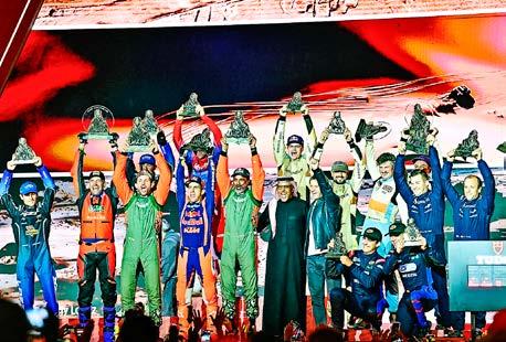 El argentino Luciano Benavides (KTM) superó al estadounidense Ricky Brabec para ganar el Rally Dakar 2026 en la categoría de motos tras una última etapa de infarto, en Yanbu, mientras que en autos se impuso por sexta vez el catarí Nasser Al Attiyah (Dacia). 1.- Los ganadores en las diferentes categorías de motor levantan sus trofeos que recibieron del príncipe saudí Khalid Bin Sultan al-Abdullah al-Faisal durante la ceremonia de entrega de premios en Arabia Saudita. 2.- El piloto qatarí de Dacia Sandriders, Nasser al-Attiyah, besa el trofeo de ganador mientras él y su compañero de equipo celebran en el podio después de ganar la 48.ª edición del Dakar. 3.- Nasser al-Attiyah (der.) y el copiloto belga Fabian Lurquin, del Dacia Sandriders, celebran tras ganar. 4.- El piloto argentino Luciano Benavides sostiene la bandera de su país mientras celebra en el podio tras ganar en la catgeoría de motococlietas. / AFP