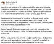 Este domingo, el presidente de Colombia, Gustavo Petro, pidió a su homóloga Claudia Sheinbaum ayuda para localizar a los artistas.