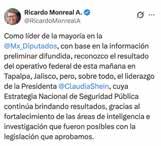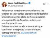 Por su parte, el secretario de Seguridad, Omar García Harfuch, también reconoció la labor del Ejército Mexicano y de la Fuerza Aérea tras la operación.