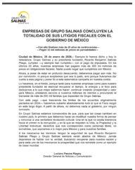 Tributaria confirmó que Grupo Salinas entregó 10 mil 400 millones 630 mil 537 pesos, mismos que ya fueron ingresados a la Tesorería de la Federación. La empresa sostuvo que con el acuerdo se cubre la totalidad de lo que exige el fisco en diversos juicios que duraron más de dos décadas NEGOCIOS P. 14 Acaba litigio: Salinas Pliego pagará al SAT 32 mil mdp, en 18 parcialidades