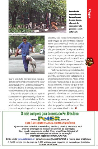giar a conduta daquele que está pagando para proporcionar bem-estar ao seu cachorro", afirma a médica veterinária Rúbia Burnier, terapeuta comportamental de animais. Segundo especialistas, quem contrata esse tipo de serviço deve tomar alguns cuidados básicos. Referências, entrevistas e descrição das atividades, assim como o caminho percorrido pelo dogwalker e seu ca-