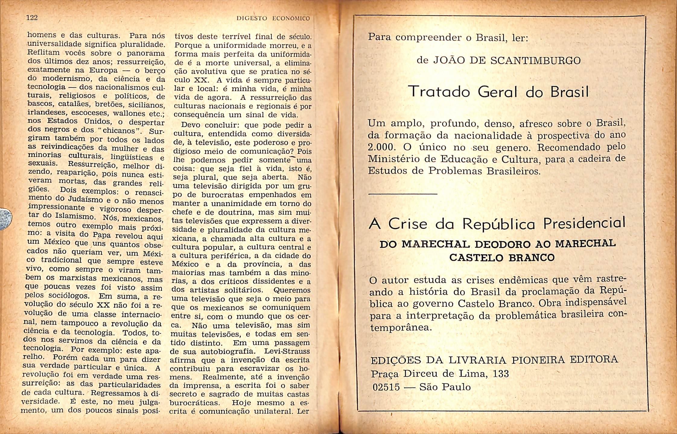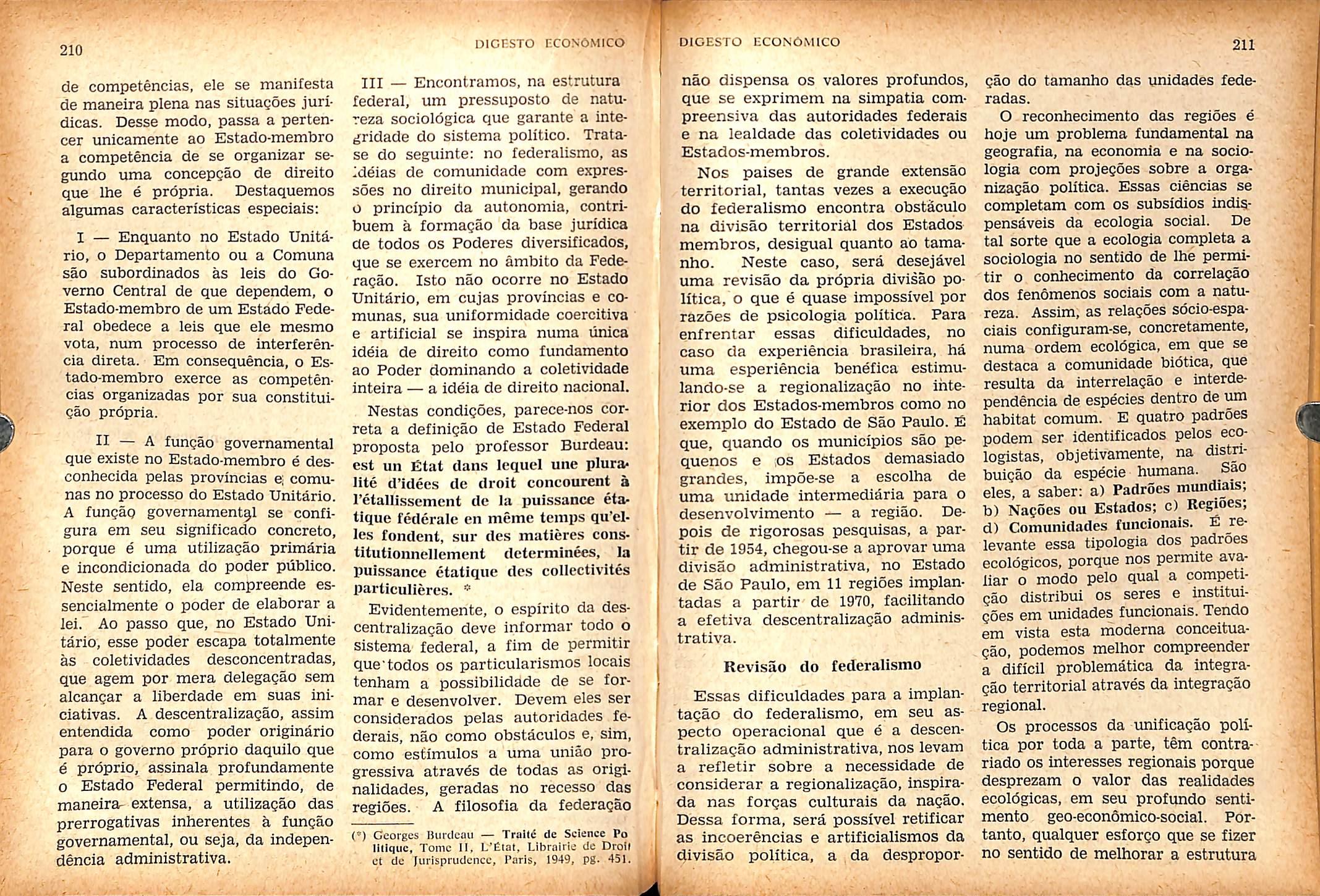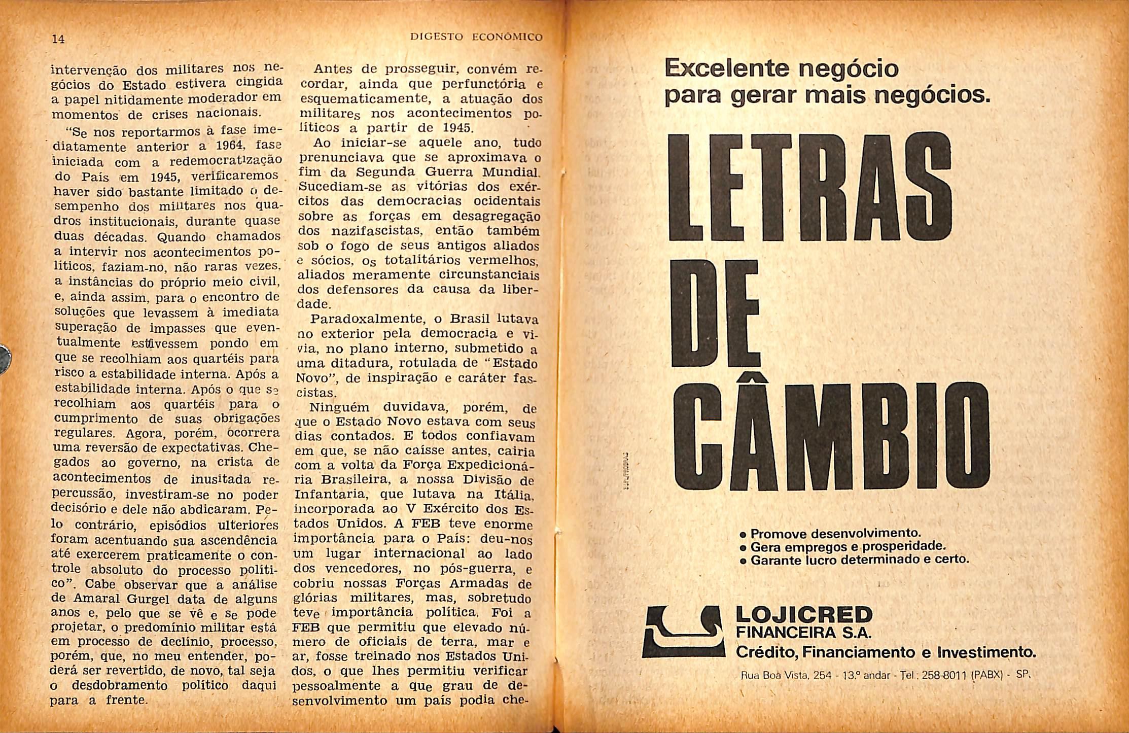 Os militares têm desempenhado importantíssimo papel na política brasileira. Do Império aos nossos dias, porém mais ainda na República, vêm participando ativamente da políti ca. Na República velha, a candidatura Hermes da Fonseca deu oportunidade à vigorosa Campanha Civilista, de Rui Bar bosa, campanha da qual restaram algumas páginas antológida língua portuguesa. A instauração da República, foi obra dos militares. Não tivessem os mai'echais Deodoro e Floriano apoiado á conspiração, e, ao menos em 15 de novembro, não teria caído o Império. Corporação de defesa, com rigoro so senso de hierarquia, as Forças Armadas brasileiras têm dado exemplo de patriotismo, de apego às tradições históri cas do Brasil. O soldado não é um político no sentido correnbrasileiro, cidadão fardado, pronto devemos ve-lo, no quadro cas te do vocábulo, mas um sempre, a servir à pátria. É como de nossas instituições. Com esse artigo, por nós agasalhado, seu autor, Flavio Galvão, procurou situar os militares na sua relação com a política. Prosseguimos na campanha pelo com bustível substitutivo, publicando artigos a respeito. O pro blema do Brasil assenta nos combustíveis fósseis. Esse, se o temos, ainda não foi extraido das entranhas da terra, no ter ritório ou na plataforma submarina, senão em quantidade mínima, inferior na proporção de 85% das nossas necessida des. Acolhemos, também, o discurso de posse do poeta nio Zuccolottò na Academia Paulista de Letras e a saudação, do ilustre sodalício, do acadêmico Alcantara SilveiSão duas formosas peças, que honram as letras brasilei ras. No mais, os artigos do DIGESTO ECONÔMICO, pela sua alta qualidade, confirmam o prestígio da revista. j i em nome ra.