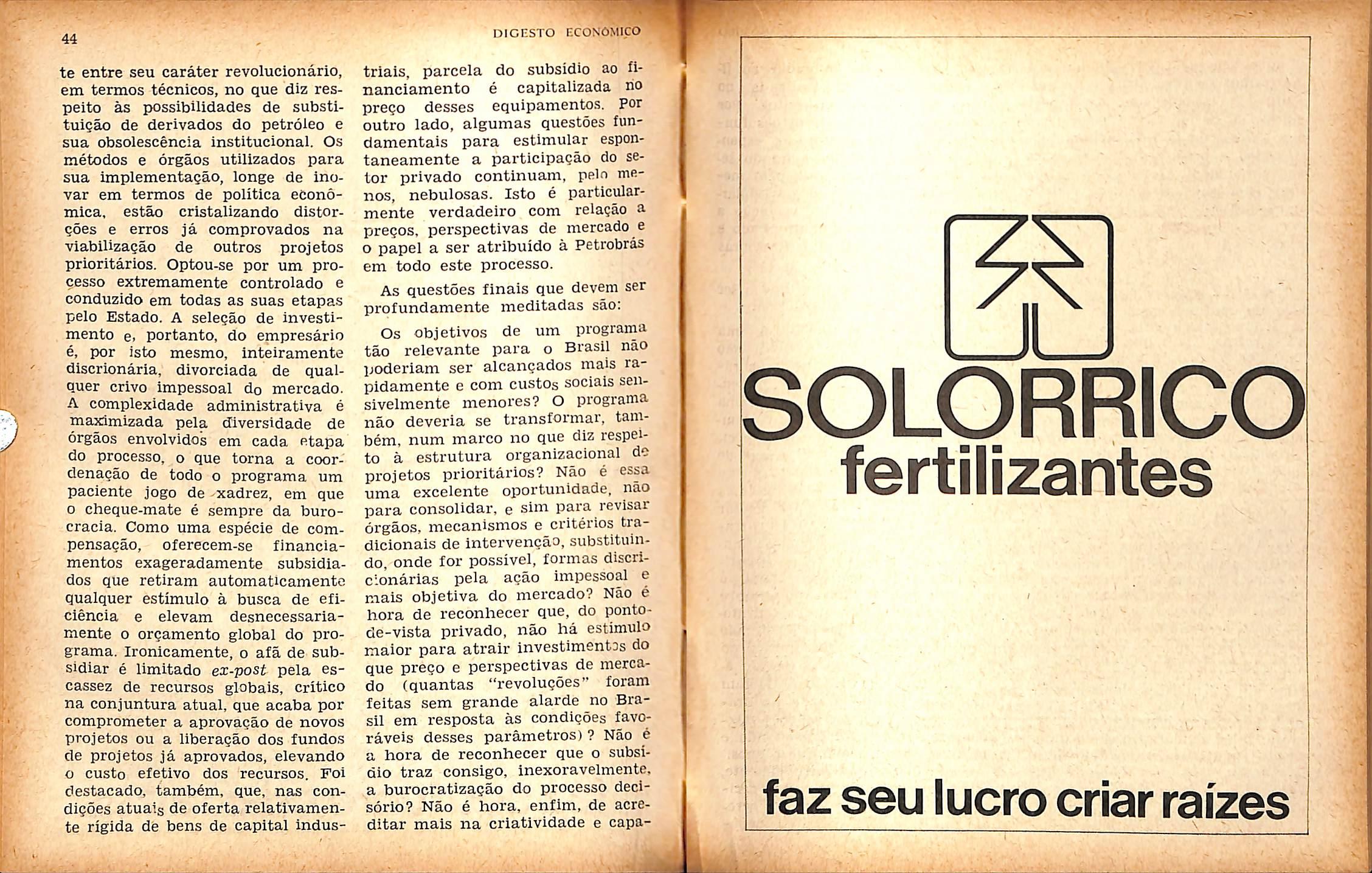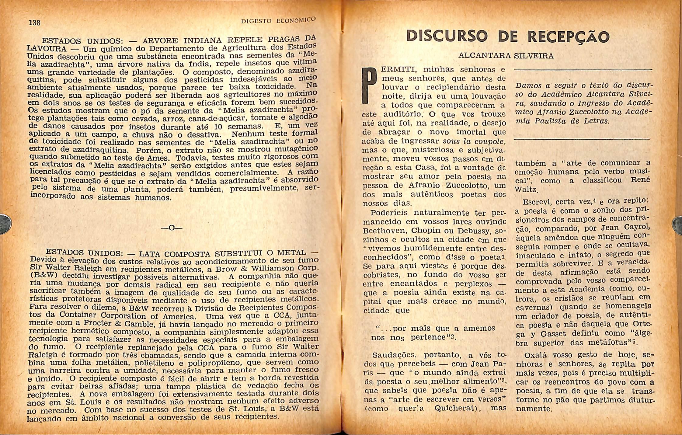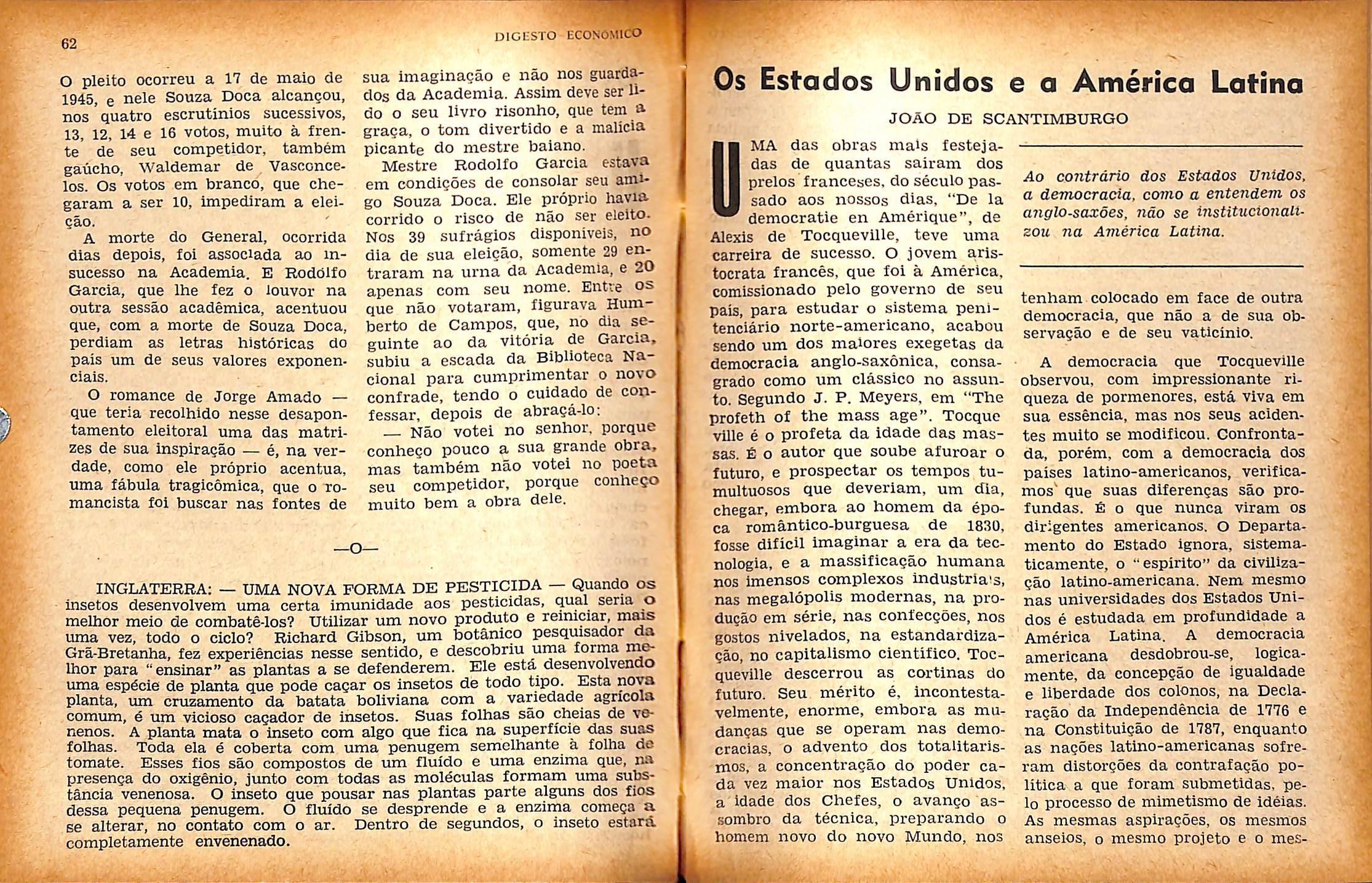 Os militares têm desempenhado importantíssimo papel na política brasileira. Do Império aos nossos dias, porém mais ainda na República, vêm participando ativamente da políti ca. Na República velha, a candidatura Hermes da Fonseca deu oportunidade à vigorosa Campanha Civilista, de Rui Bar bosa, campanha da qual restaram algumas páginas antológida língua portuguesa. A instauração da República, foi obra dos militares. Não tivessem os mai'echais Deodoro e Floriano apoiado á conspiração, e, ao menos em 15 de novembro, não teria caído o Império. Corporação de defesa, com rigoro so senso de hierarquia, as Forças Armadas brasileiras têm dado exemplo de patriotismo, de apego às tradições históri cas do Brasil. O soldado não é um político no sentido correnbrasileiro, cidadão fardado, pronto devemos ve-lo, no quadro cas te do vocábulo, mas um sempre, a servir à pátria. É como de nossas instituições. Com esse artigo, por nós agasalhado, seu autor, Flavio Galvão, procurou situar os militares na sua relação com a política. Prosseguimos na campanha pelo com bustível substitutivo, publicando artigos a respeito. O pro blema do Brasil assenta nos combustíveis fósseis. Esse, se o temos, ainda não foi extraido das entranhas da terra, no ter ritório ou na plataforma submarina, senão em quantidade mínima, inferior na proporção de 85% das nossas necessida des. Acolhemos, também, o discurso de posse do poeta nio Zuccolottò na Academia Paulista de Letras e a saudação, do ilustre sodalício, do acadêmico Alcantara SilveiSão duas formosas peças, que honram as letras brasilei ras. No mais, os artigos do DIGESTO ECONÔMICO, pela sua alta qualidade, confirmam o prestígio da revista. j i em nome ra.