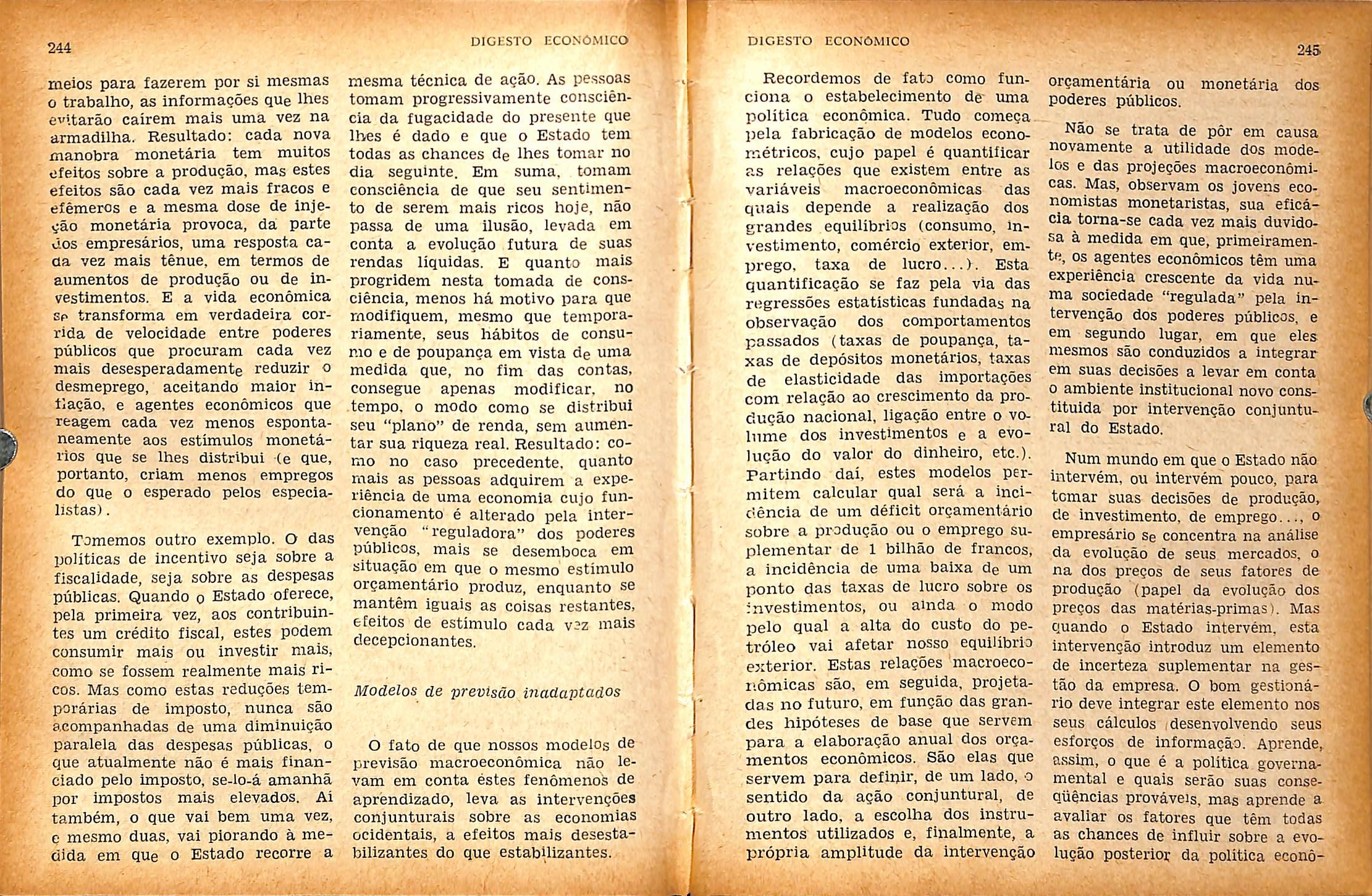 Não se trata de pôr em causa novamente a utilidade dos mode los e das projeções macroeconômi cas. Mas, observam os jovens eco nomistas monetaristas, sua eficá cia toma-se cada vez mais duvidoà medida em que, primeiramen te, os agentes econômicos têm experiência crescente da vida nu ma sociedade “regulada” pela in tervenção dos poderes públicos, e em segundo lugar, em que eles mesmos são conduzidos a integrar em suas decisões a levar em conta 0 ambiente institucional novo cons tituída por intervenção conjuntu ral do Estado.