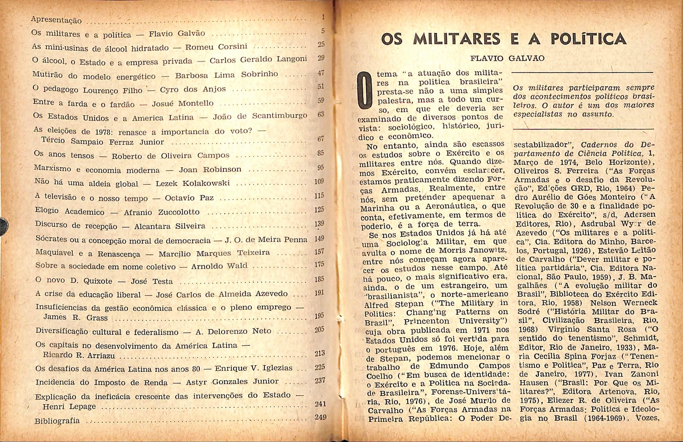 Na República Velha, cabería exa minar principalmente a atuação dos militares na política durante as presidências de Deodoro) de Floriano Peixoto e de Hermes da Fonseca. O interesse seria funda mentalmente de caráter histórico e, ao meu ver, o que hoje desperta maior atenção é a atuação dos mi litares na polít'ca de nossos dias, se possível buscando-se projeções e antecipações sobre qual poderá vir a ser no quadro novo que se está abrindo no Pais.