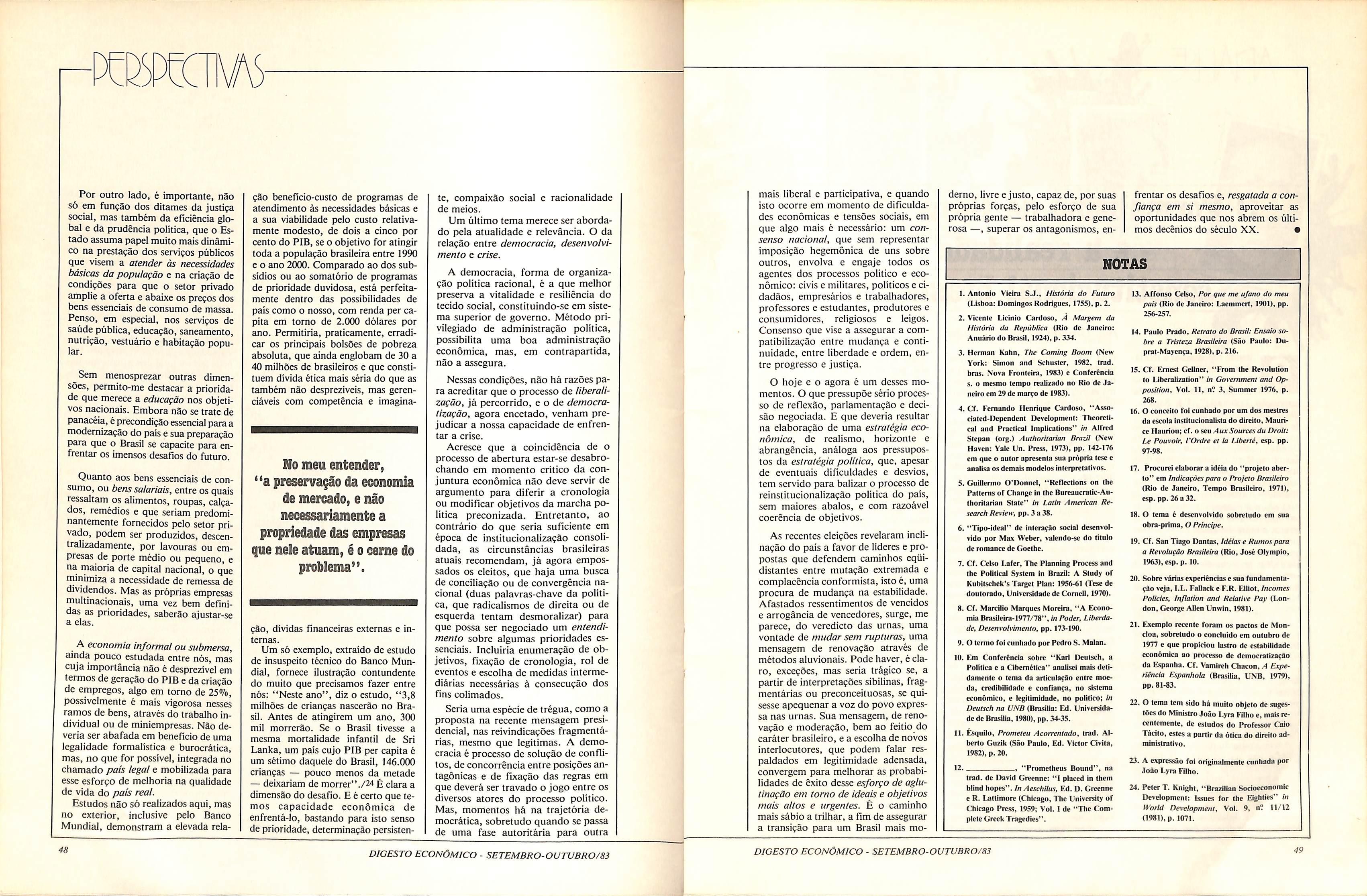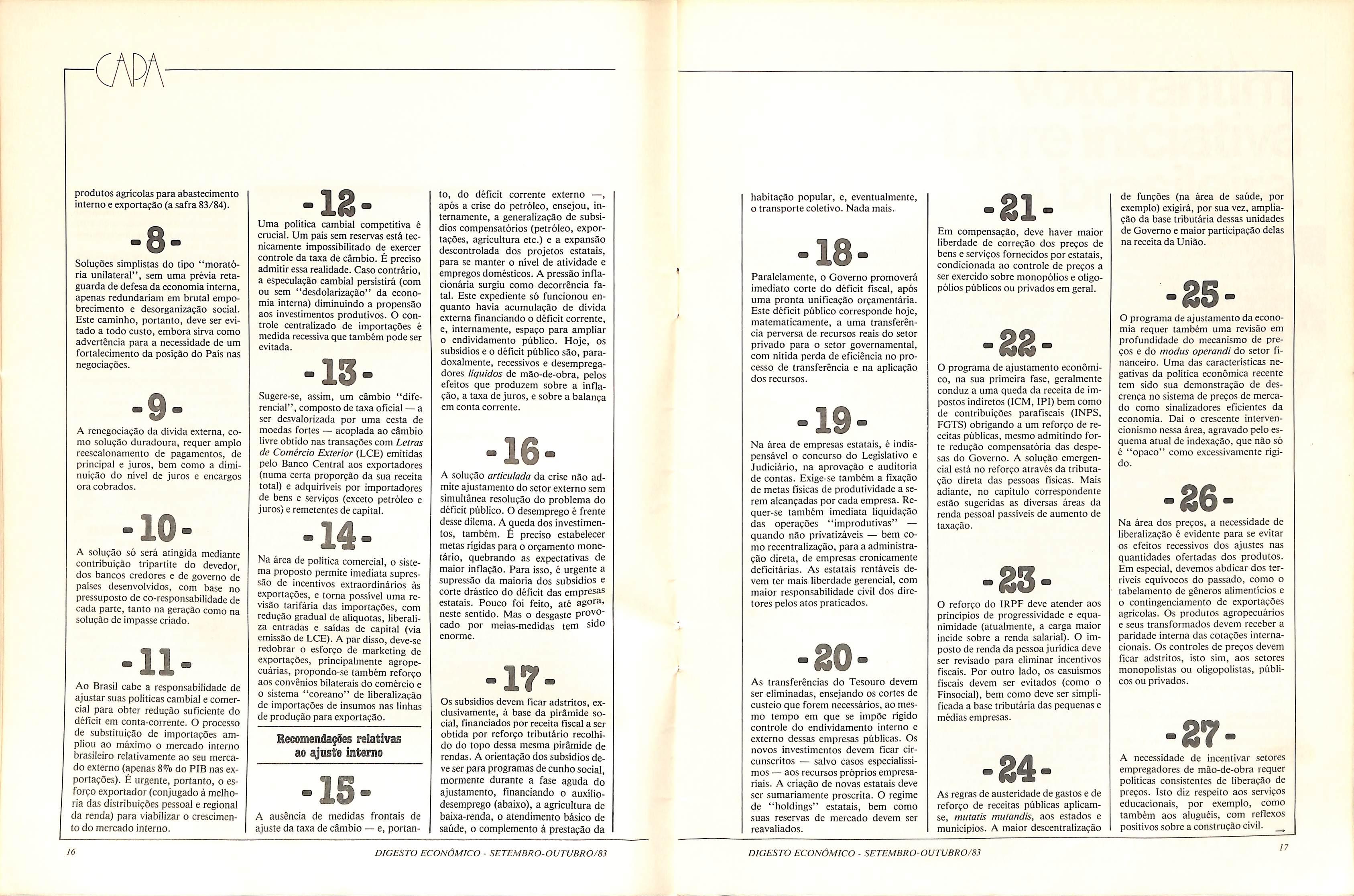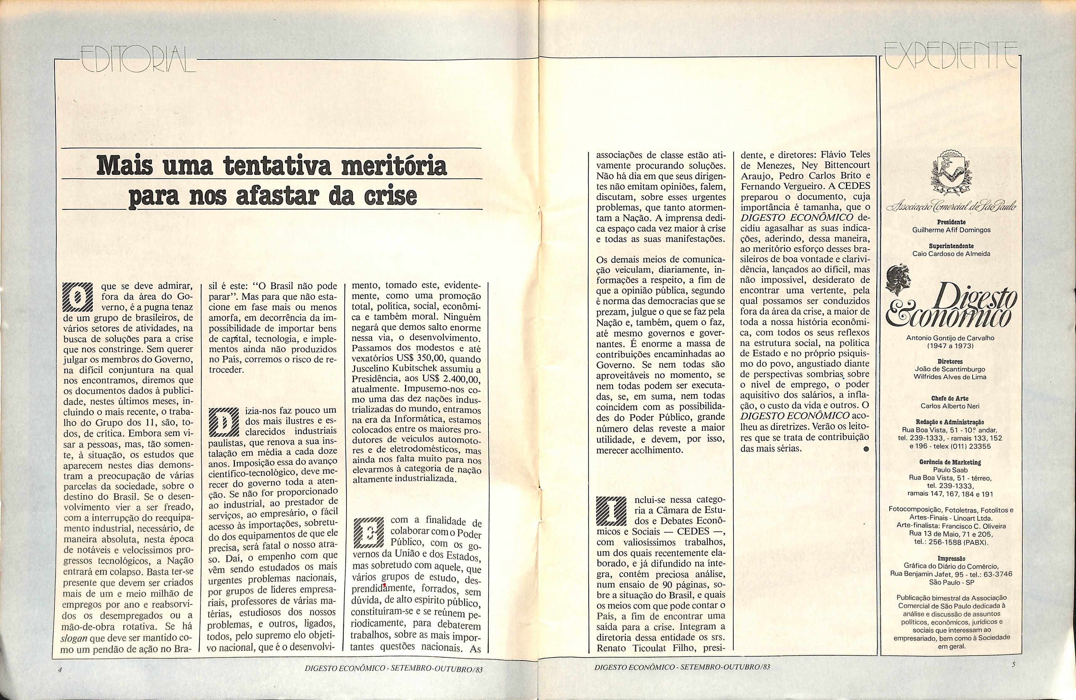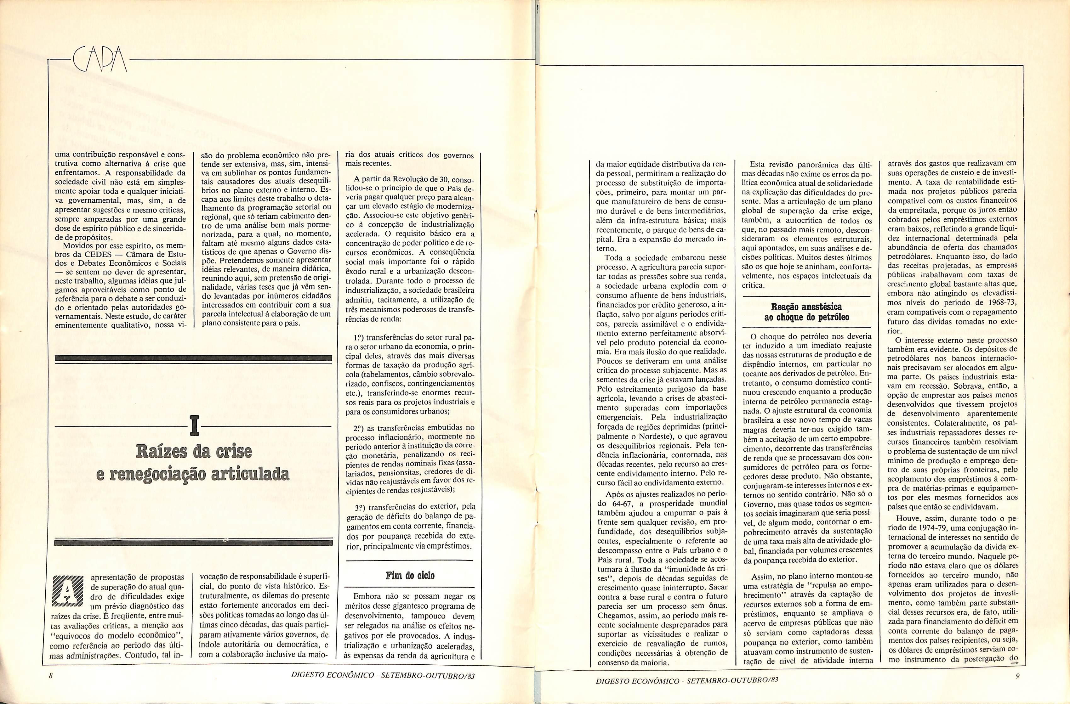 dente, e diretores: Flávio Teles de Menezes, Ney Bittencourt Araújo, Pedro Carlos Brito e Fernando Vergueiro. A CEDES preparou o documento, cuja importância é tamanha, que o DIGESTO ECONÔMICO de cidiu agasalhar as suas indica ções, aderindo, dessa maneira, ao meritório esforço desses bra sileiros de boa vontade e clarivi dência, lançados ao difícil, mas não impossível, desiderato de encontrar uma vertente, pela qual possamos ser conduzidos fora da área da crise, a maior de toda a nossa história econômi ca, com todos os seus reflexos na estrutura social, na política de Estado e no próprio psiquismo do povo, angustiado diante de perspectivas sombrias, sobre o nível de emprego, o poder aquisitivo dos salários, a infla ção, o custo da vida e outros. O DIGESTO ECONÔMICO aco lheu as diretrizes. Verão os leito res que se trata de contribuição das mais sérias. ●