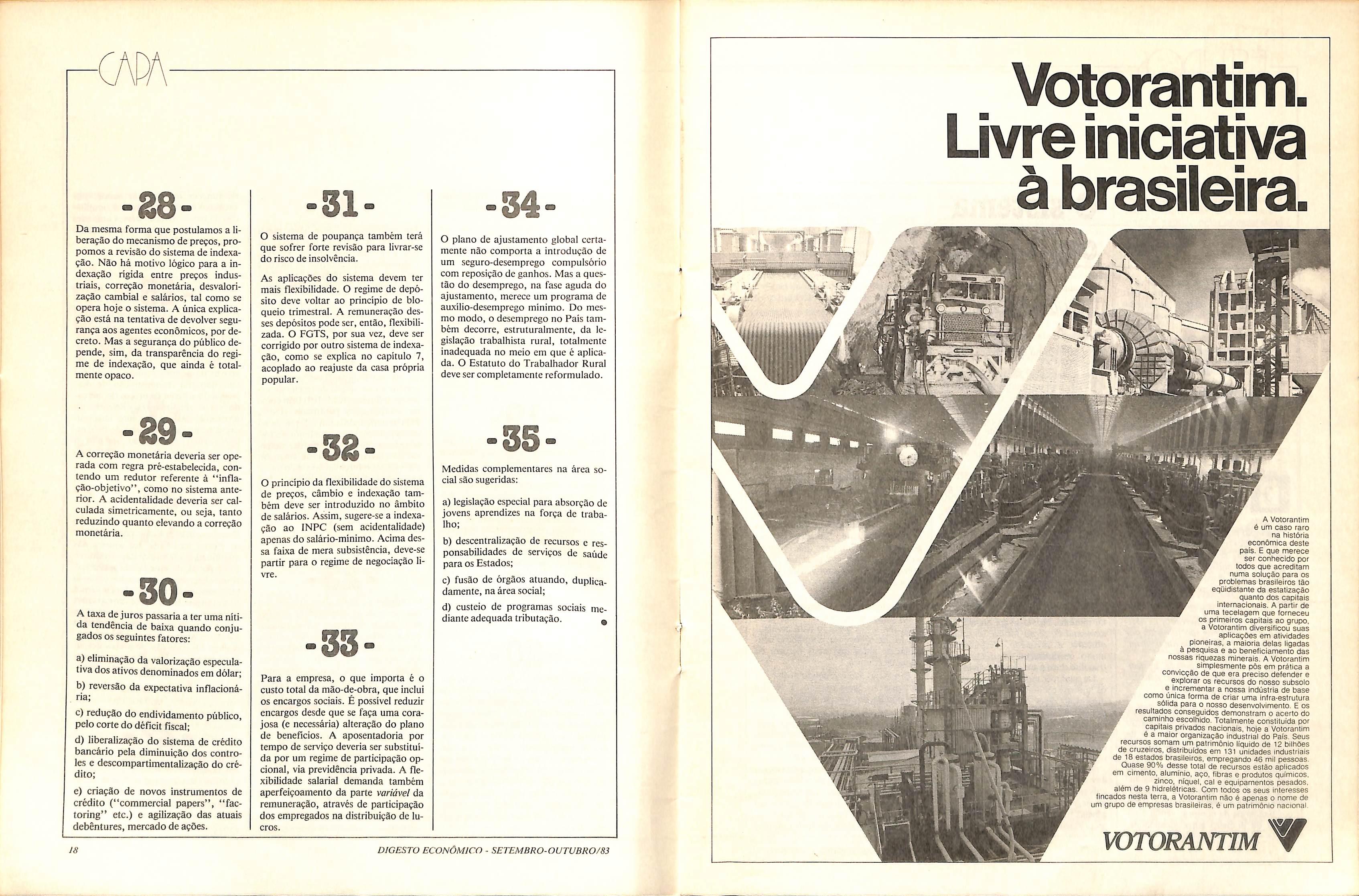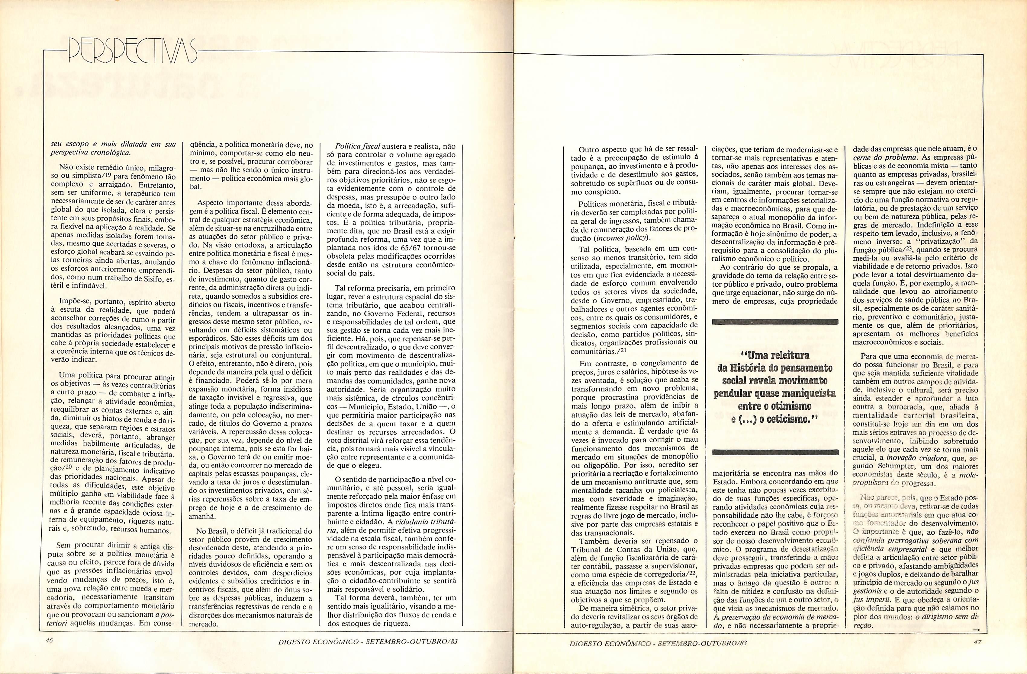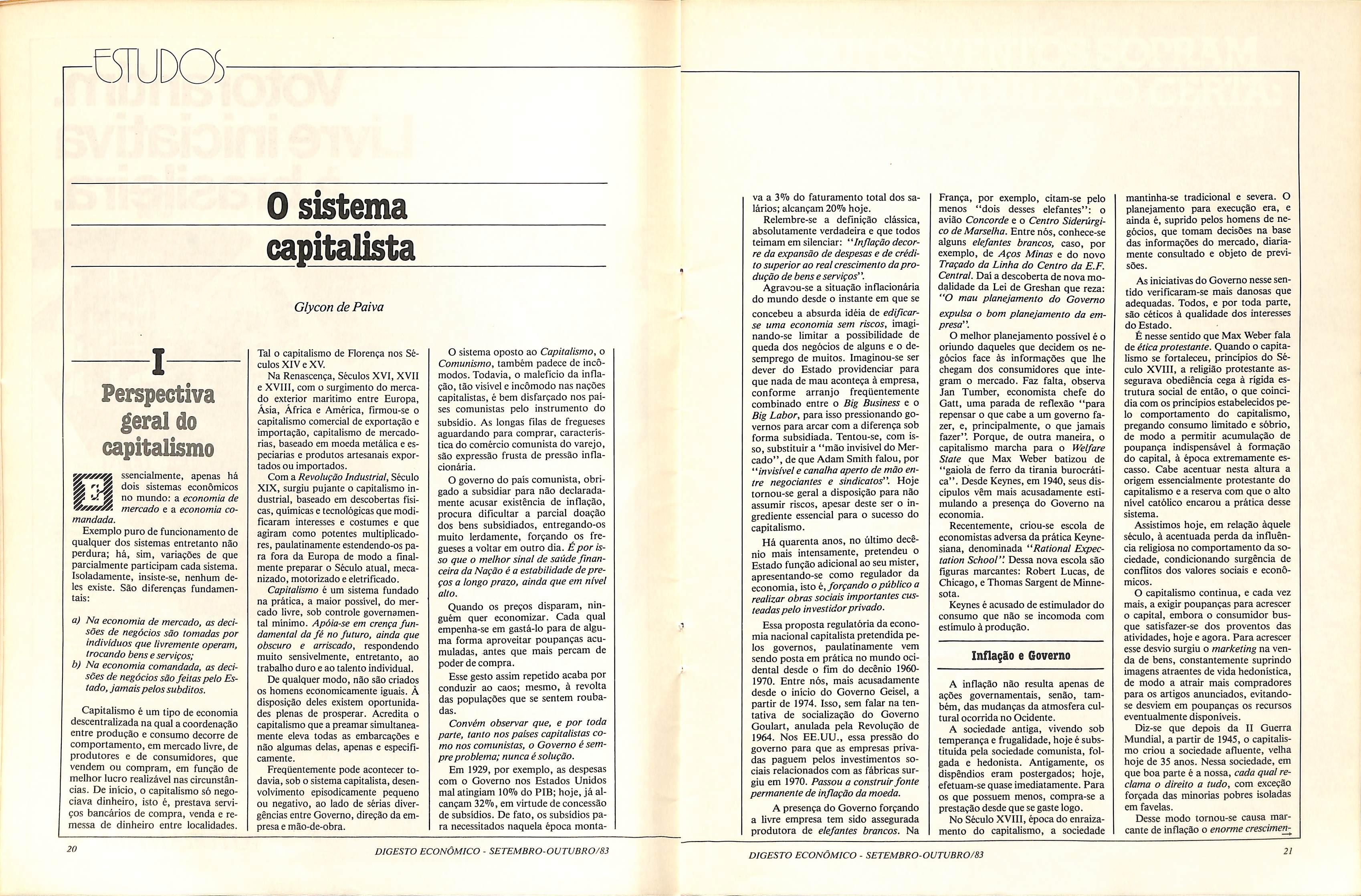 dente, e diretores: Flávio Teles de Menezes, Ney Bittencourt Araújo, Pedro Carlos Brito e Fernando Vergueiro. A CEDES preparou o documento, cuja importância é tamanha, que o DIGESTO ECONÔMICO de cidiu agasalhar as suas indica ções, aderindo, dessa maneira, ao meritório esforço desses bra sileiros de boa vontade e clarivi dência, lançados ao difícil, mas não impossível, desiderato de encontrar uma vertente, pela qual possamos ser conduzidos fora da área da crise, a maior de toda a nossa história econômi ca, com todos os seus reflexos na estrutura social, na política de Estado e no próprio psiquismo do povo, angustiado diante de perspectivas sombrias, sobre o nível de emprego, o poder aquisitivo dos salários, a infla ção, o custo da vida e outros. O DIGESTO ECONÔMICO aco lheu as diretrizes. Verão os leito res que se trata de contribuição das mais sérias. ●
