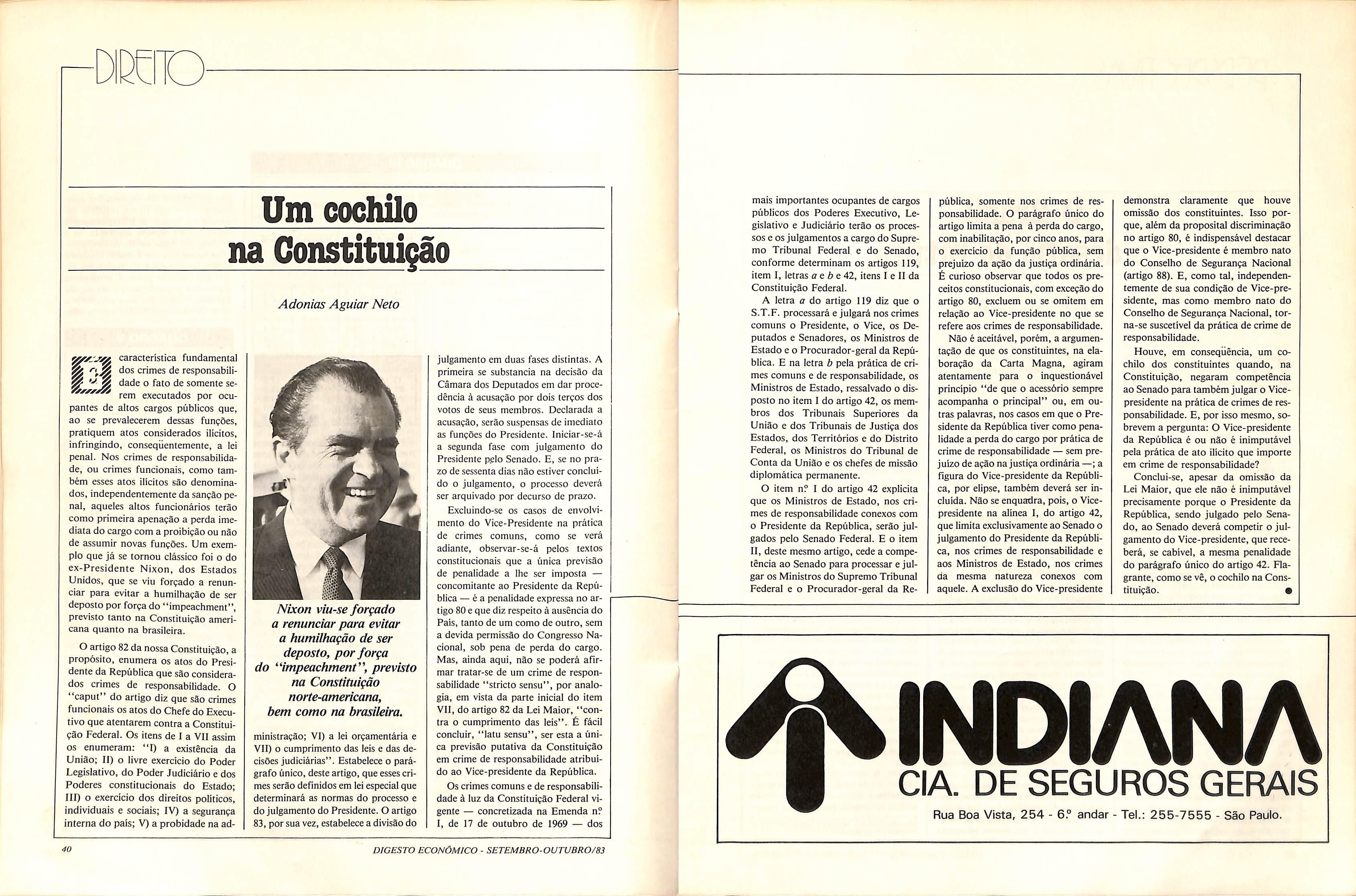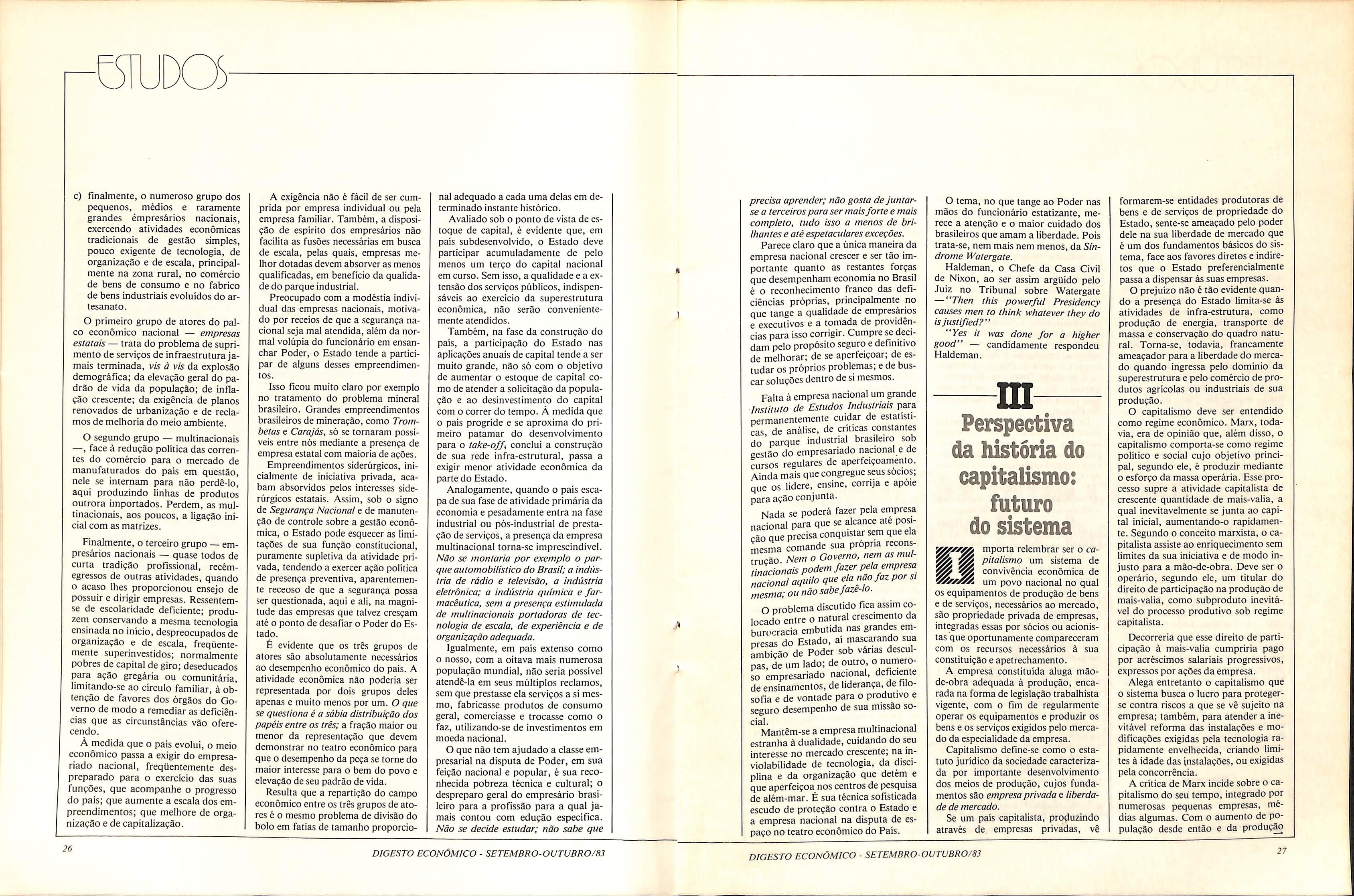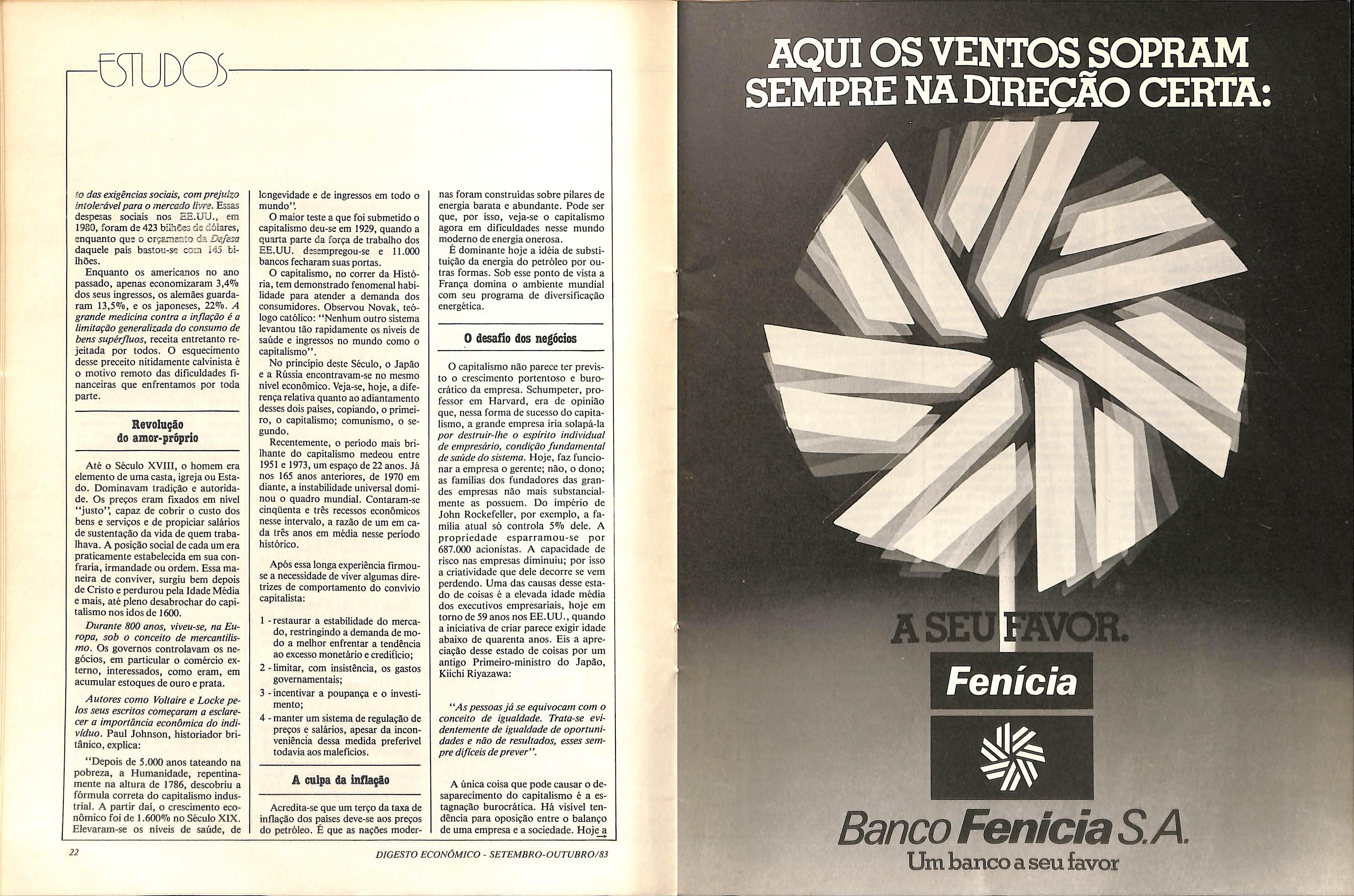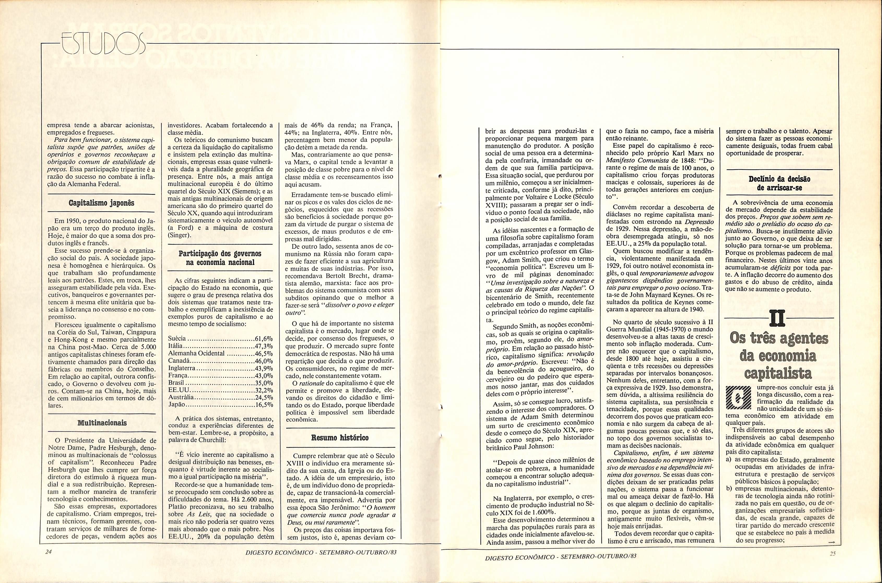 dente, e diretores: Flávio Teles de Menezes, Ney Bittencourt Araújo, Pedro Carlos Brito e Fernando Vergueiro. A CEDES preparou o documento, cuja importância é tamanha, que o DIGESTO ECONÔMICO de cidiu agasalhar as suas indica ções, aderindo, dessa maneira, ao meritório esforço desses bra sileiros de boa vontade e clarivi dência, lançados ao difícil, mas não impossível, desiderato de encontrar uma vertente, pela qual possamos ser conduzidos fora da área da crise, a maior de toda a nossa história econômi ca, com todos os seus reflexos na estrutura social, na política de Estado e no próprio psiquismo do povo, angustiado diante de perspectivas sombrias, sobre o nível de emprego, o poder aquisitivo dos salários, a infla ção, o custo da vida e outros. O DIGESTO ECONÔMICO aco lheu as diretrizes. Verão os leito res que se trata de contribuição das mais sérias. ●