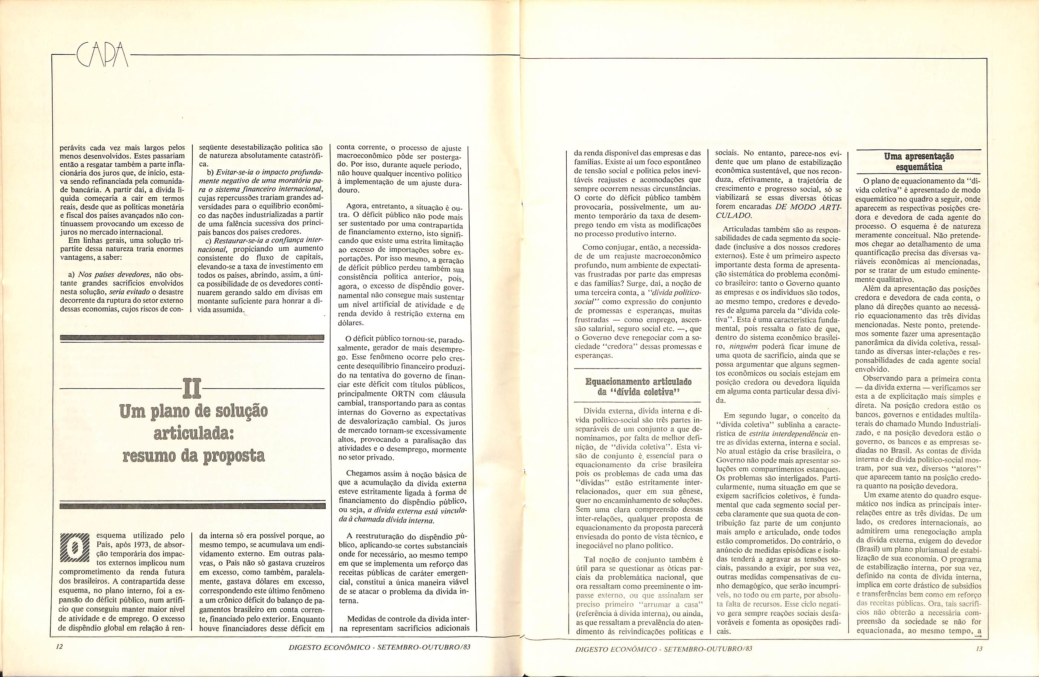 Assim sendo, o mito da moratória unilateral “inofensiva” é primo irmão do déficit incontrolávcl. Os dois cami nham juntos, e, portanto, devem ser combatidos simultaneamente, através de um programa econômico compe tente que afaste não só a perspectiva sombria de um repúdio da nossa dívi da externa, como também a falsa no ção de que o excesso de gastos gover namentais pode sustentar o nível de atividade e de emprego. Para romper as dificuldades da hora presente, deve mos, por conseguinte, atuar de modo articulado, sobre estes dois focos de pressão: a dívida externa e o déficit in terno. Sobre esses dois temas discuti remos a seguir, começando pela ques tão da divida externa.