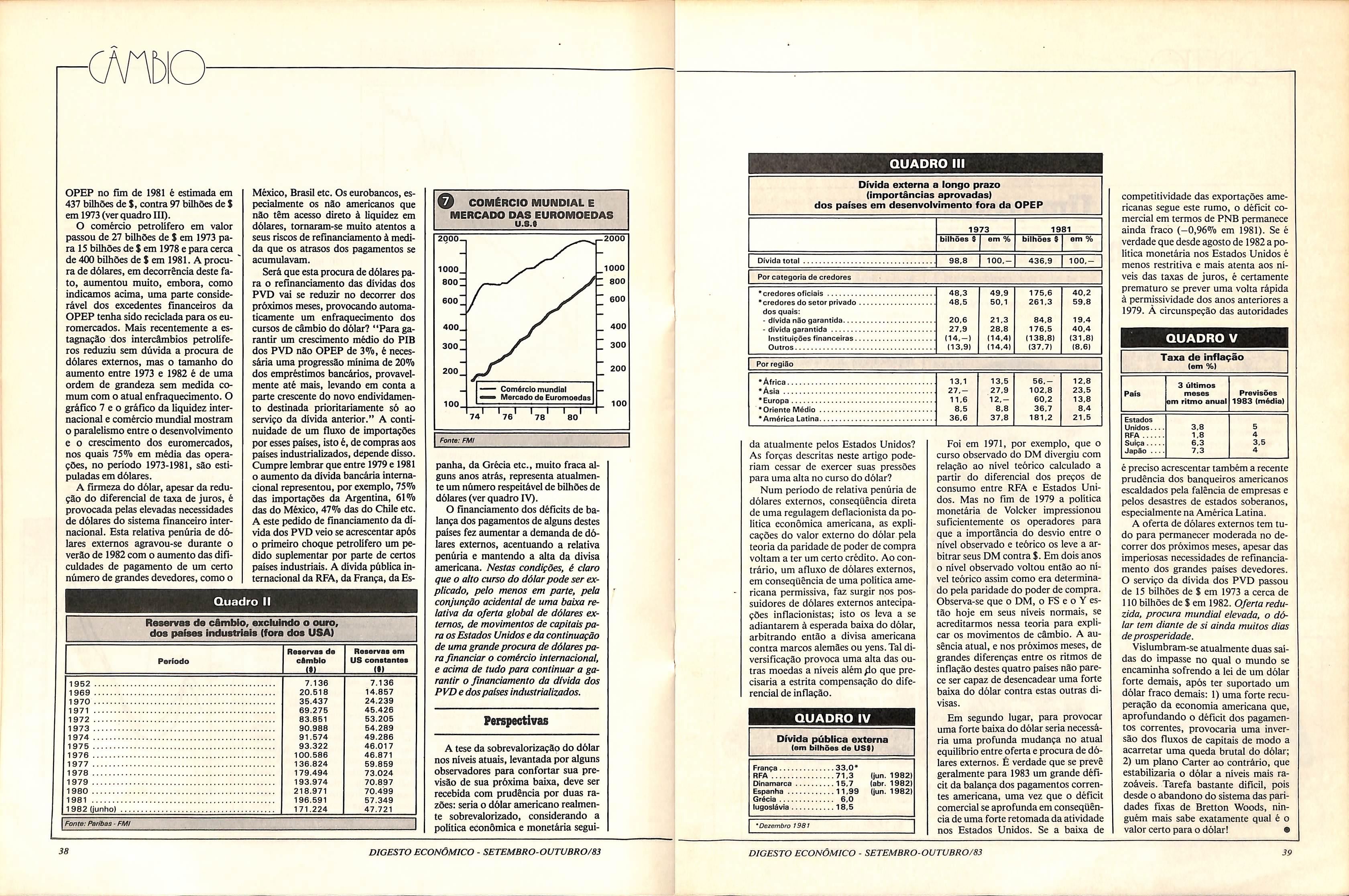 O interesse externo neste processo também era evidente. Os depósitos de petrodólares nos bancos internacio nais precisavam ser alocados em algu ma parte. Os países industriais esta vam em recessão. Sobrava, então, a opção de emprestar aos países menos desenvolvidos que tivessem projetos de desenvolvimento aparentemente consistentes. Colateralmente, os paí ses industriais repassadores desses re cursos financeiros também resolviam o problema de sustentação de um nível mínimo de produção e emprego den tro de suas próprias fronteiras, pelo acoplamento dos empréstimos à com pra de matérias-primas e equipamen tos por eles mesmos fornecidos aos países que então se endividavam.